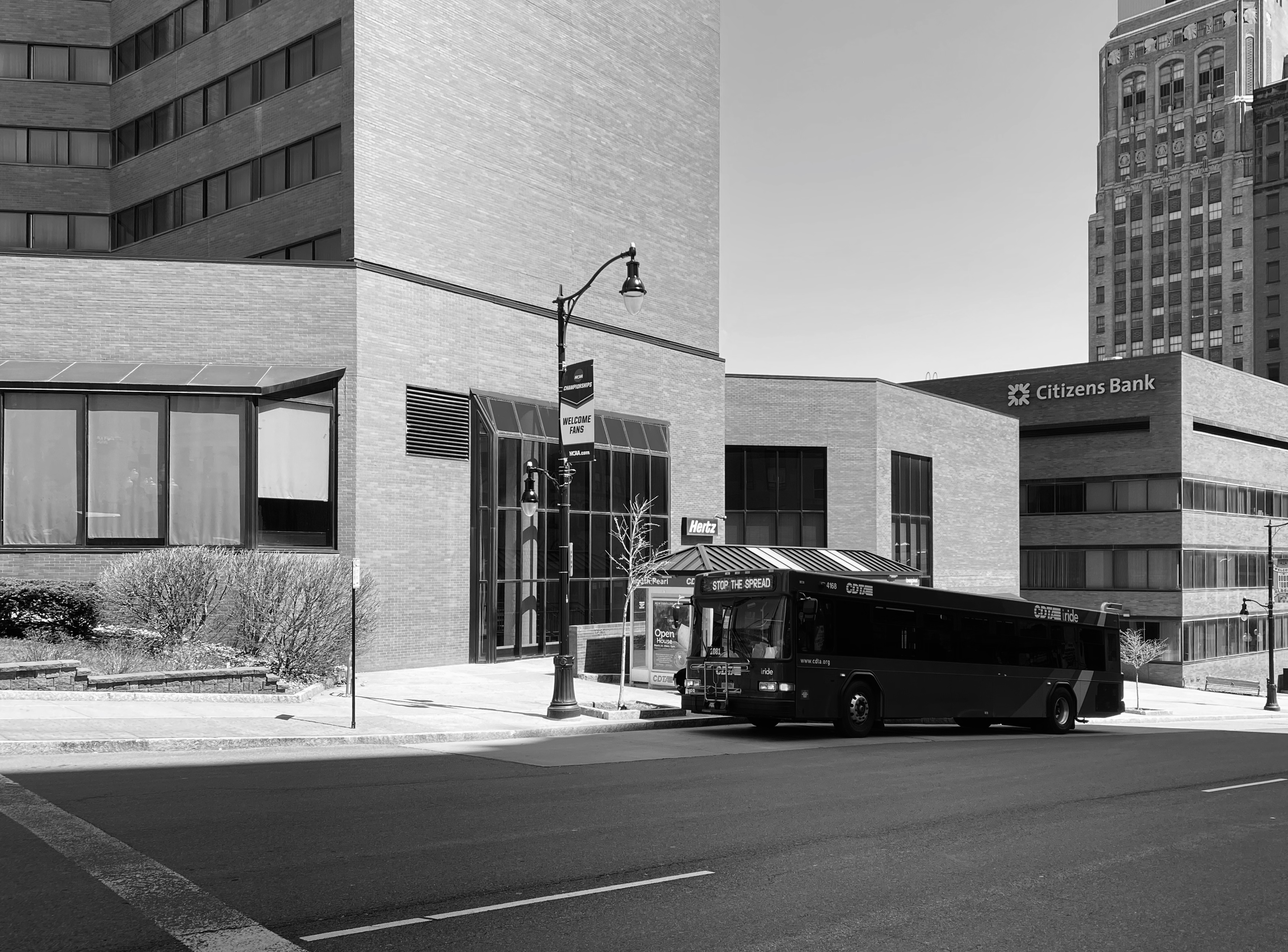 A CDTA bus pulling up to a bus stop on State Street in Downtown Albany, NY in late April. All riders were required to wear masks, and there were barely any riders on the bus. Its electronic sign reads, “STOP THE SPREAD.”
