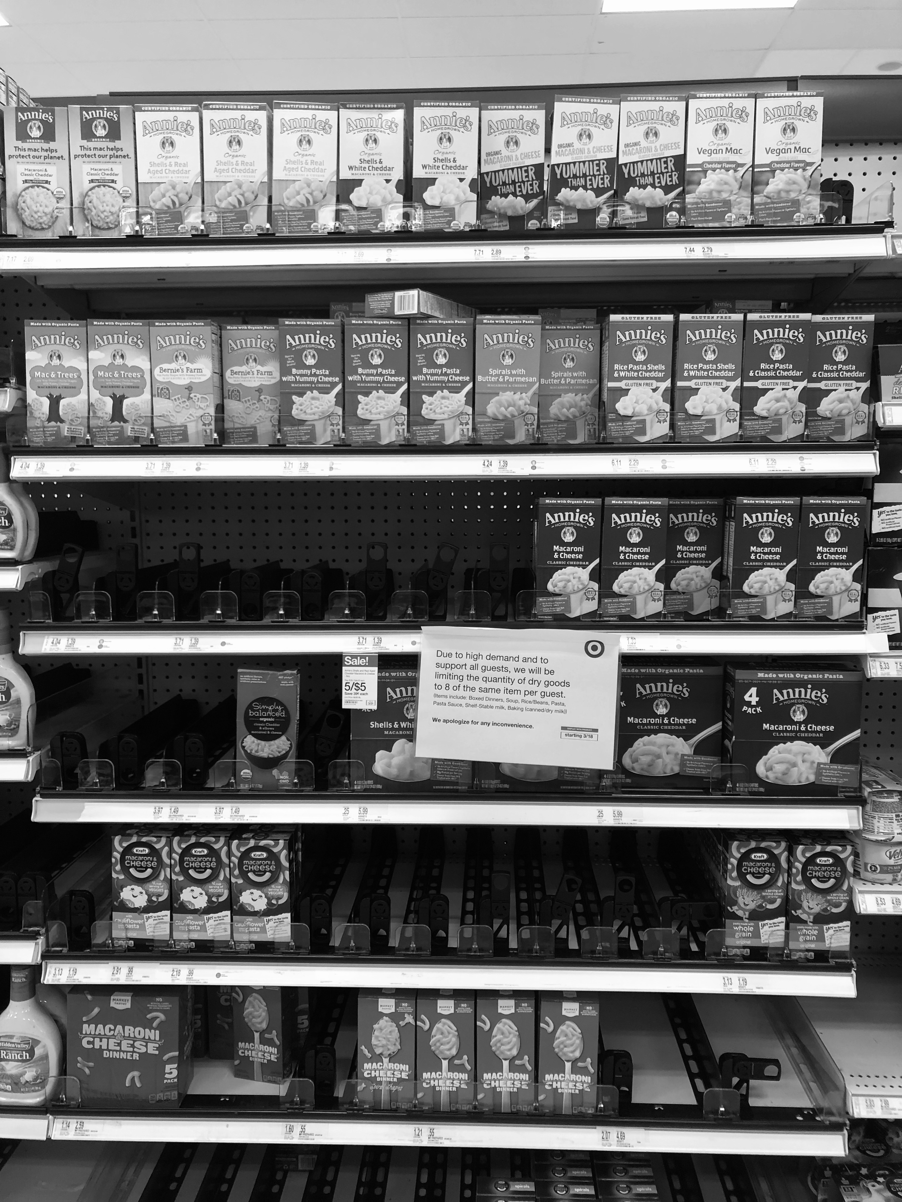 A few shelves of boxed macaroni and cheese at Target in Niskayuna, NY in early April and a note limiting the amount one dry good per customer. Normally, these shelves are fully stocked.