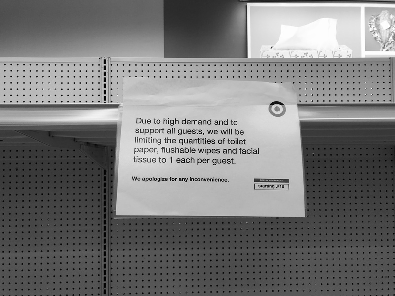 An empty shelf at Target in Niskayuna, NY in early April. The shelf here is normally fully stocked with toilet paper, flushable wipes, and facial tissue. The note explains a purchase limit of 1 product per guest, although there was none to be had in the store.