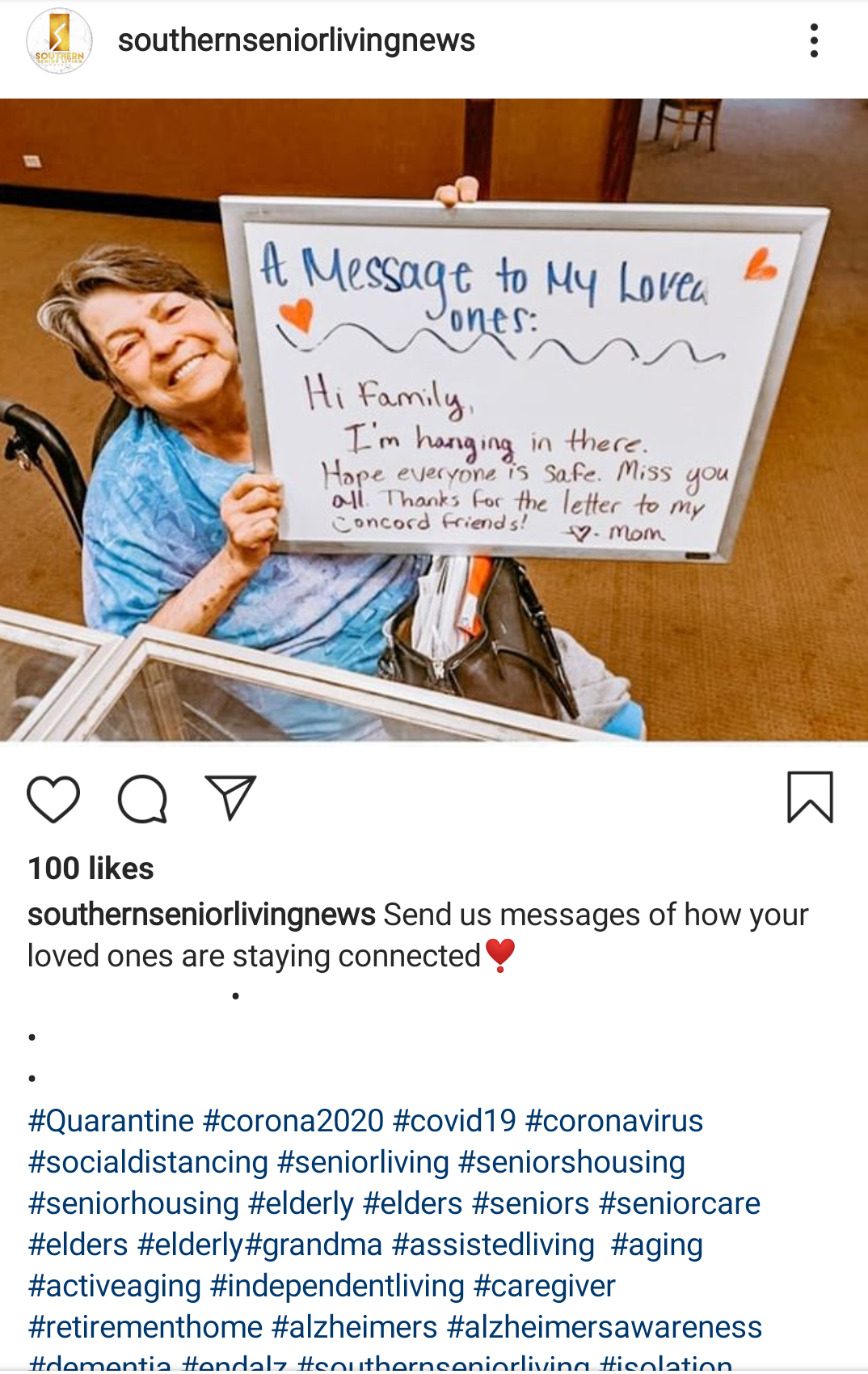 Instagram account southernseniorlivingnews posts a photo of a woman holding up a whiteboard with a message to her family reading "Hi family, I'm hanging in there. Hope everyone is safe. Miss you all. Thanks for the letter to my Concord friends! <3 Mom". COVID has made it way more difficult to see and communicate with loved ones who live inside an assisted living, nursing home, or other community for older adults. Protecting them also means restricting our contact with them and that can be extremely difficult for both parties.