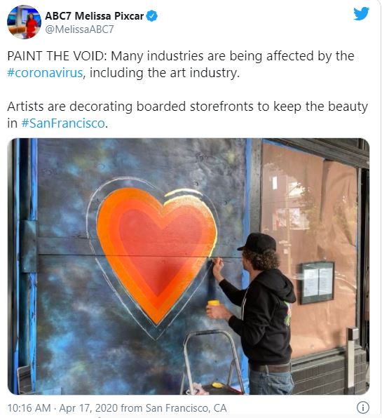 Businesses across the San Francisco Bay Area have closed, some temporary and some permanently, as a result of California's COVID-19 shelter-in-place orders. Those that hope to re-open have boarded up their windows to try to protect their stores and inventory. As a result of the crushing economic blow of the COVID-19 pandemic, the vibrancy of San Francisco streets has vanished. In response, local arts are turning boarded storefronts into beautiful murals with messages of hope. Local artists are "bringing life and beauty to our streets, sending messages of love to people in their community." Two local art agencies, Building 180 and Art for Civil Discourse, have teamed up and created Paint the Void. Paint the Void pairs local artists with boarded up businesses in an attempt to beautify the city and "to bring hope into the community and inspire people." Artists hope to eventually auction their murals and donate the funds raised to those in need.