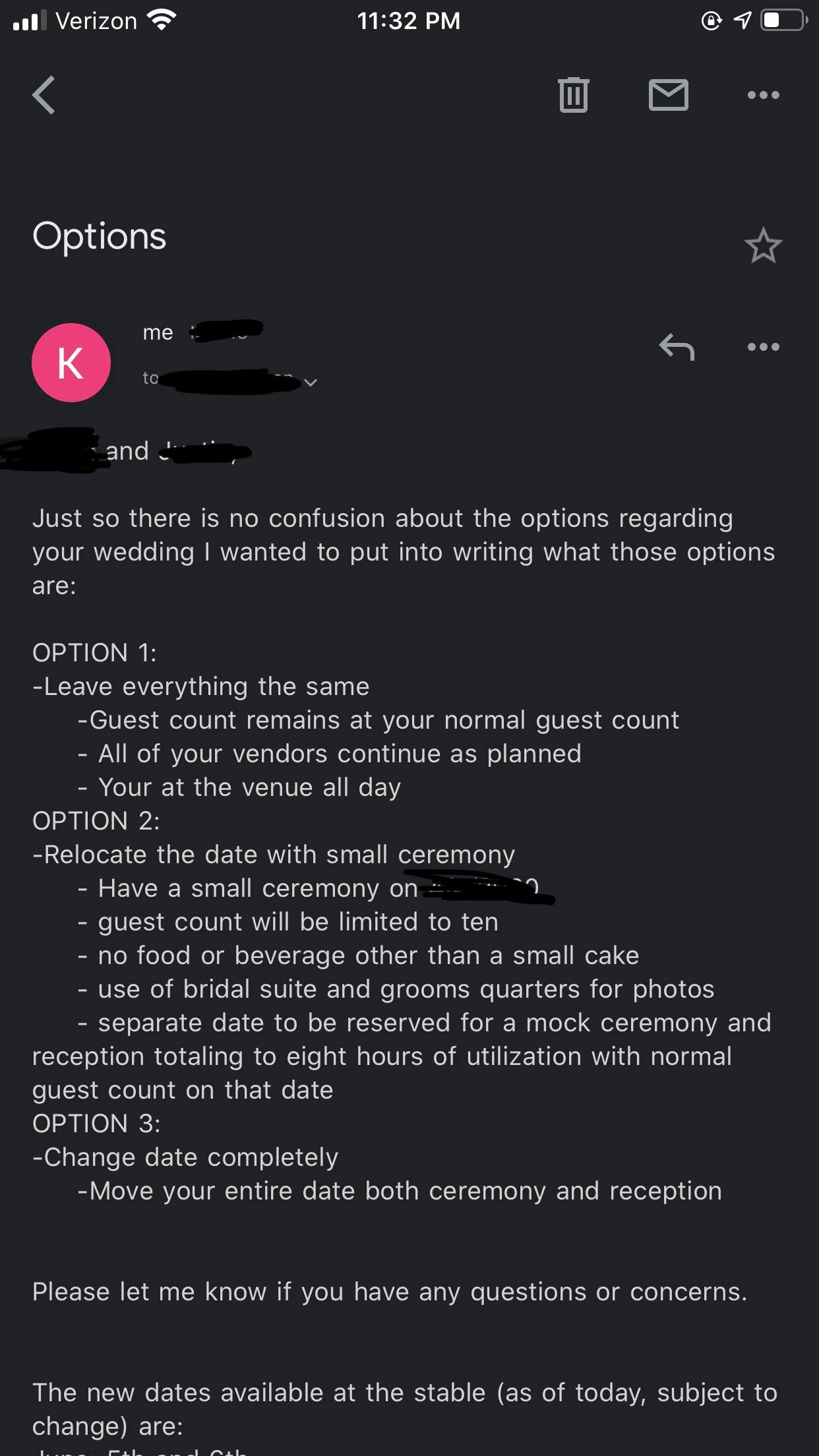 This is an email I had to send to a bride who was upset over COVID-19 ruining her wedding plans. These options were developed after deciding what was doable under mandates at the time. The bride ended up moving her wedding to 2021 and had an intimate ceremony in her home.