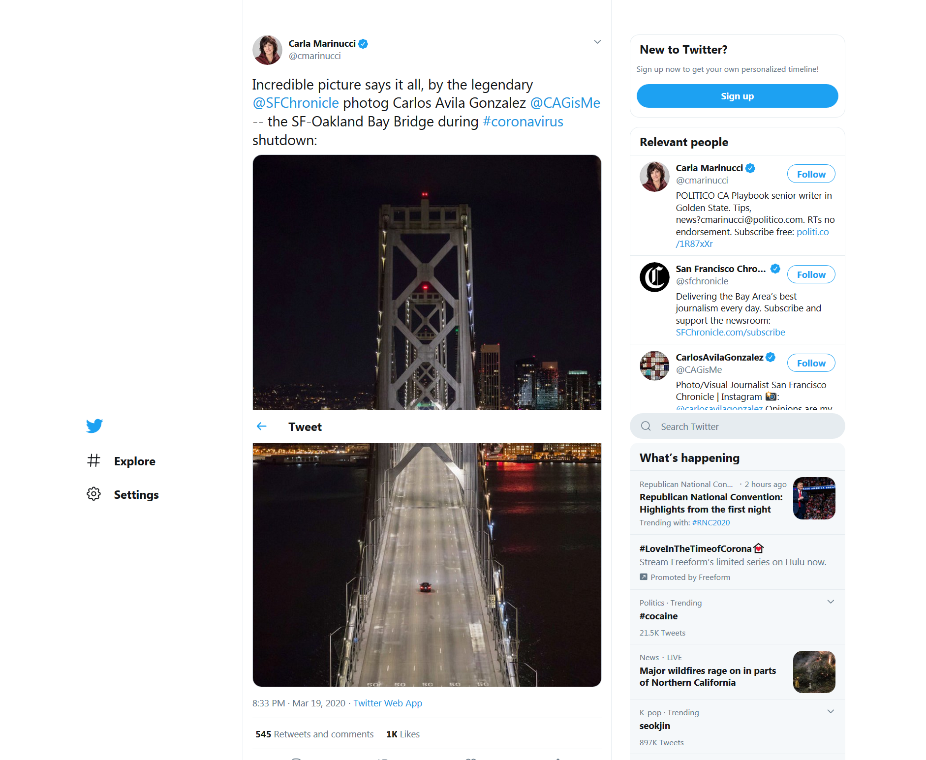This is a picture of the Oakland Bridge in the Bay Area, California, while completely empty due to the initial Covid-19 lockdown. This bridge normally has thousands and thousands of people crossing it on any given day, and at any given moment it will typically be packed with commuters. In the photo, it's almost completely empty. This uncanny image was the first thing that made me, living in a city on the opposite side of the country, realize just how serious the virus would be. At this point in time, most of my friends and family still believed we would be going back to school within the month of March. It was unimaginable that we would still be dealing with the pandemic in August, when I am writing this, and that we probably will be dealing with this for the foreseeable future. The response to this pandemic was quite obviously botched by the US and its institutions that are supposed to protect us, and by the end of this hundreds of thousands of people will be dead as a result. I fear a lot of people in the future will blame this tragedy on everyday people's failure to lockdown, and I think this image serves as an essential reminder that when we were first told to lock down, the American people locked down.
