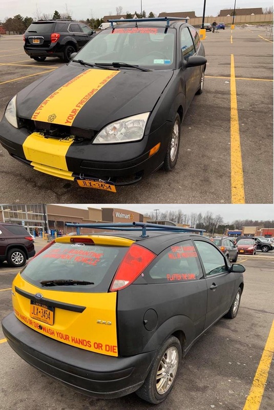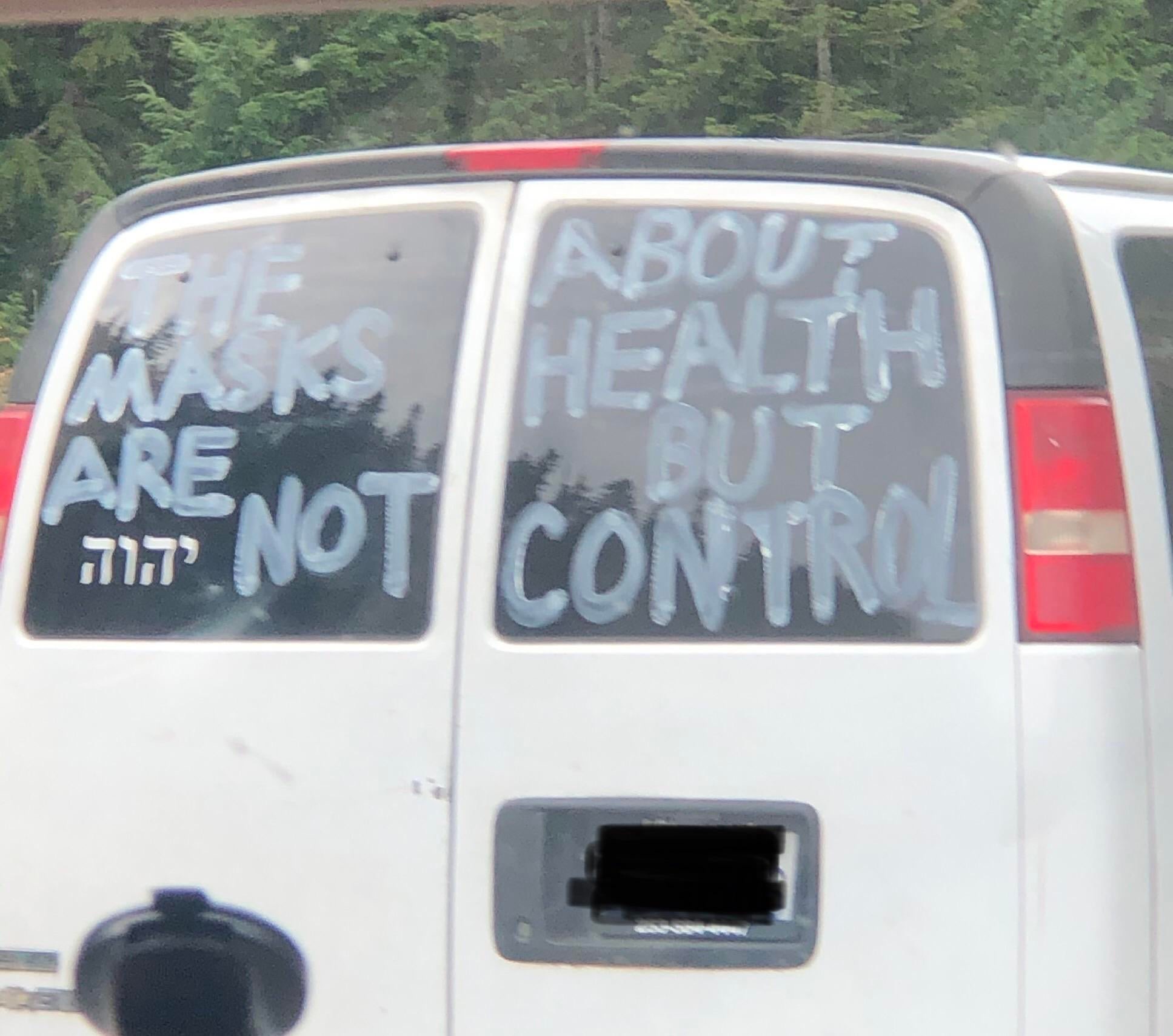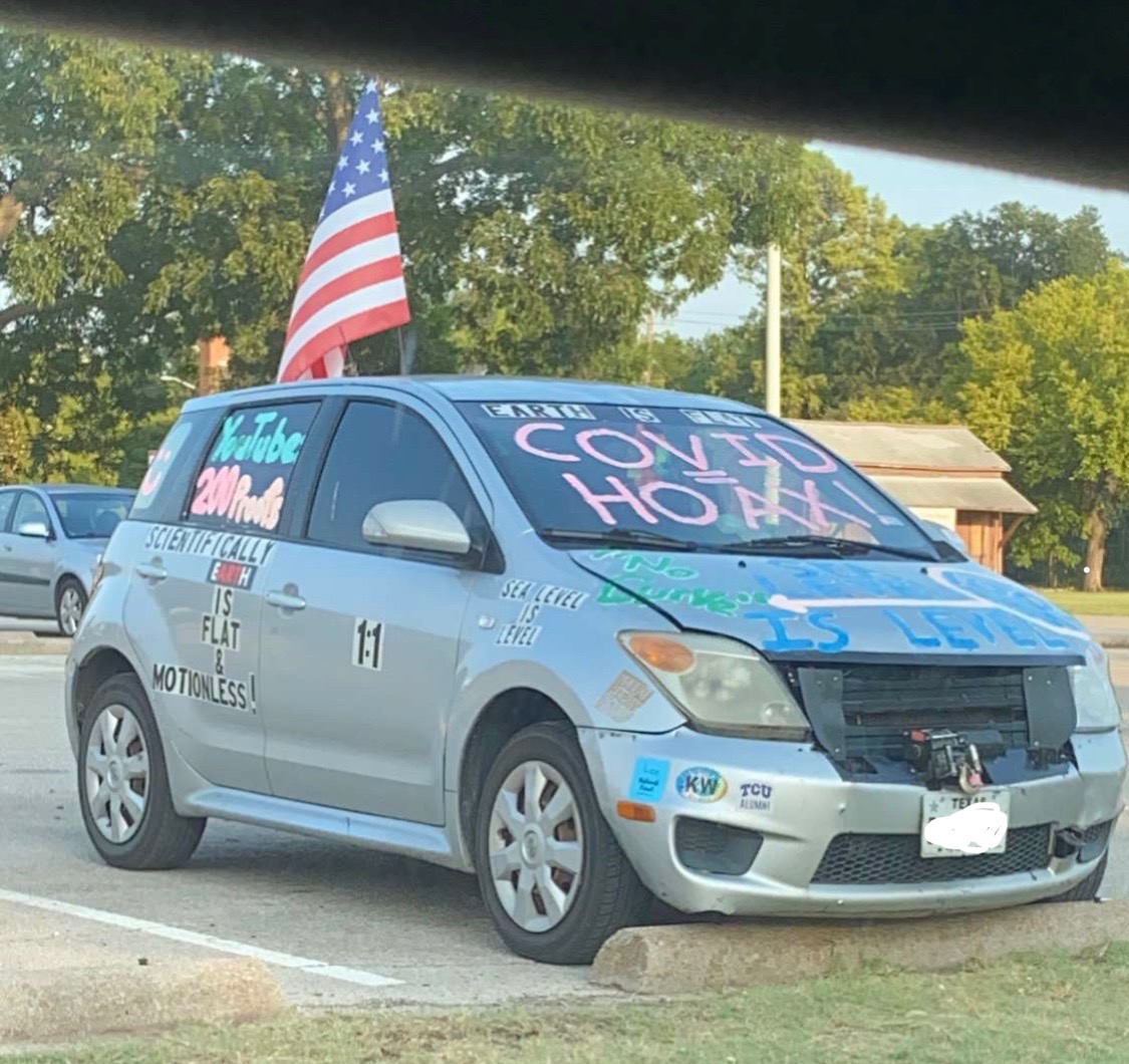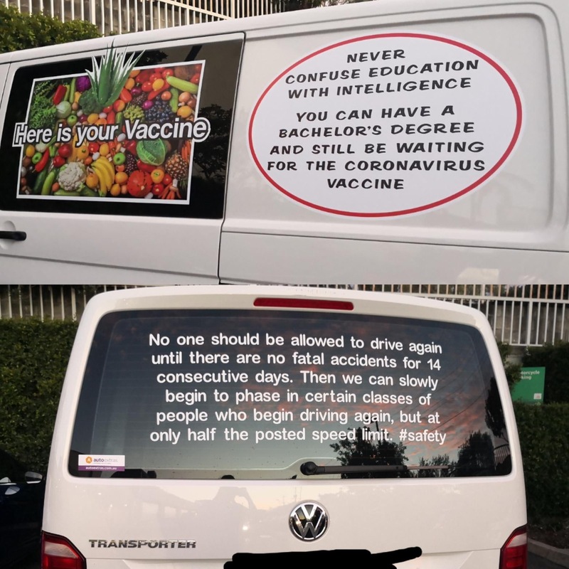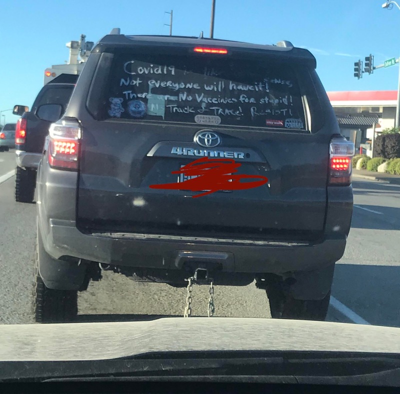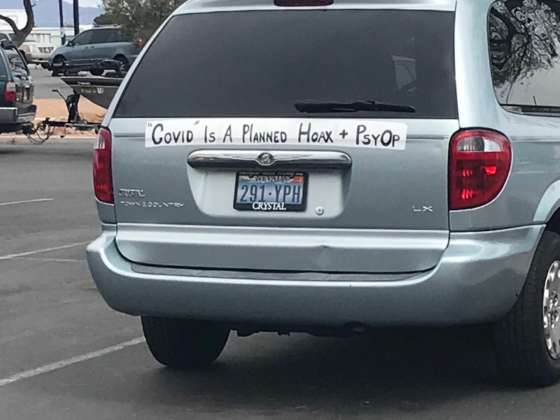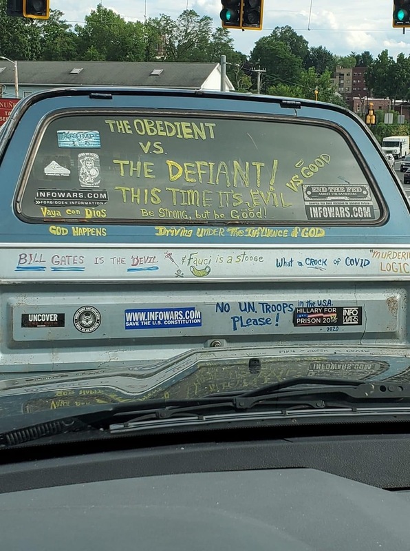 These photos have been selected from material uploaded to the subreddit /r/InfowarriorRides and depict various bumper stickers, graffiti and 'folk art' applied to vehicles and captured in snapshots by various users of the subreddits. These are highly ephemeral sources that capture a fascinating and important aspect of the public response to COVID-19, demonstrating a wide breadth of artistic expression ranging from urging people to take common sense precautions to expositions of elaborate conspiracy theories.