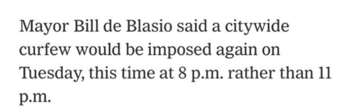 On June 2nd, Mayor De Blasio changed the already established curfew from 11pm-5am to 8pm-5am. This was a very historical moment in New York, as there has never been any curfew enforced on the city in my lifetime and 8pm seemed very early. I worried for essential workers and anyone who had to rely on public transportation to get home for work, as they were arresting people who were out after 8pm if they did not have a valid excuse or explanation. Photo retrieved from the New York Times.
