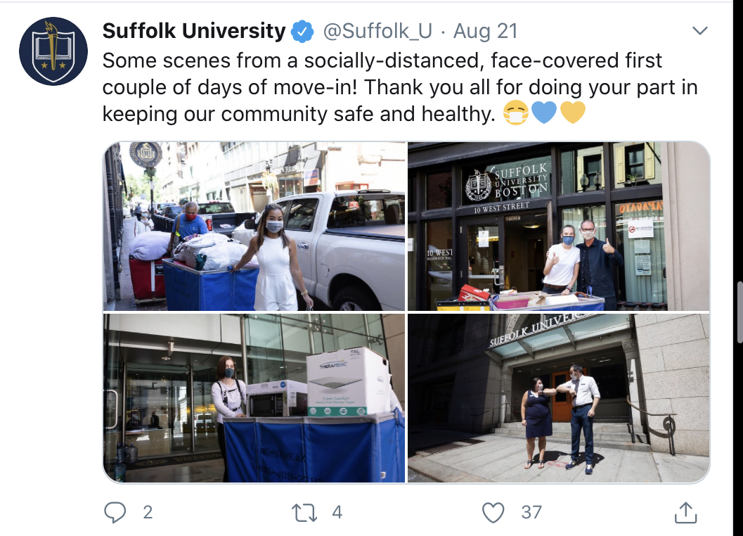 Though the struggles of online class is not my only concern for this fall semester, instead I’m more concerned that this new social distancing environment will make it more difficult to meet new people and to make connections. Suffolk has gone to great lengths to provide not only safe learning spaces, but also safe public spaces and single room boarding for its students although theses new policy make living in a new place feel even more lonely. To combat this new social divide Suffolk has been creating virtual and in person social distancing events that have allowed students and staff to get to know each other. These events have done a great job at making me feel more apart of the Suffolk community, and have lessened my fears about this upcoming semester.