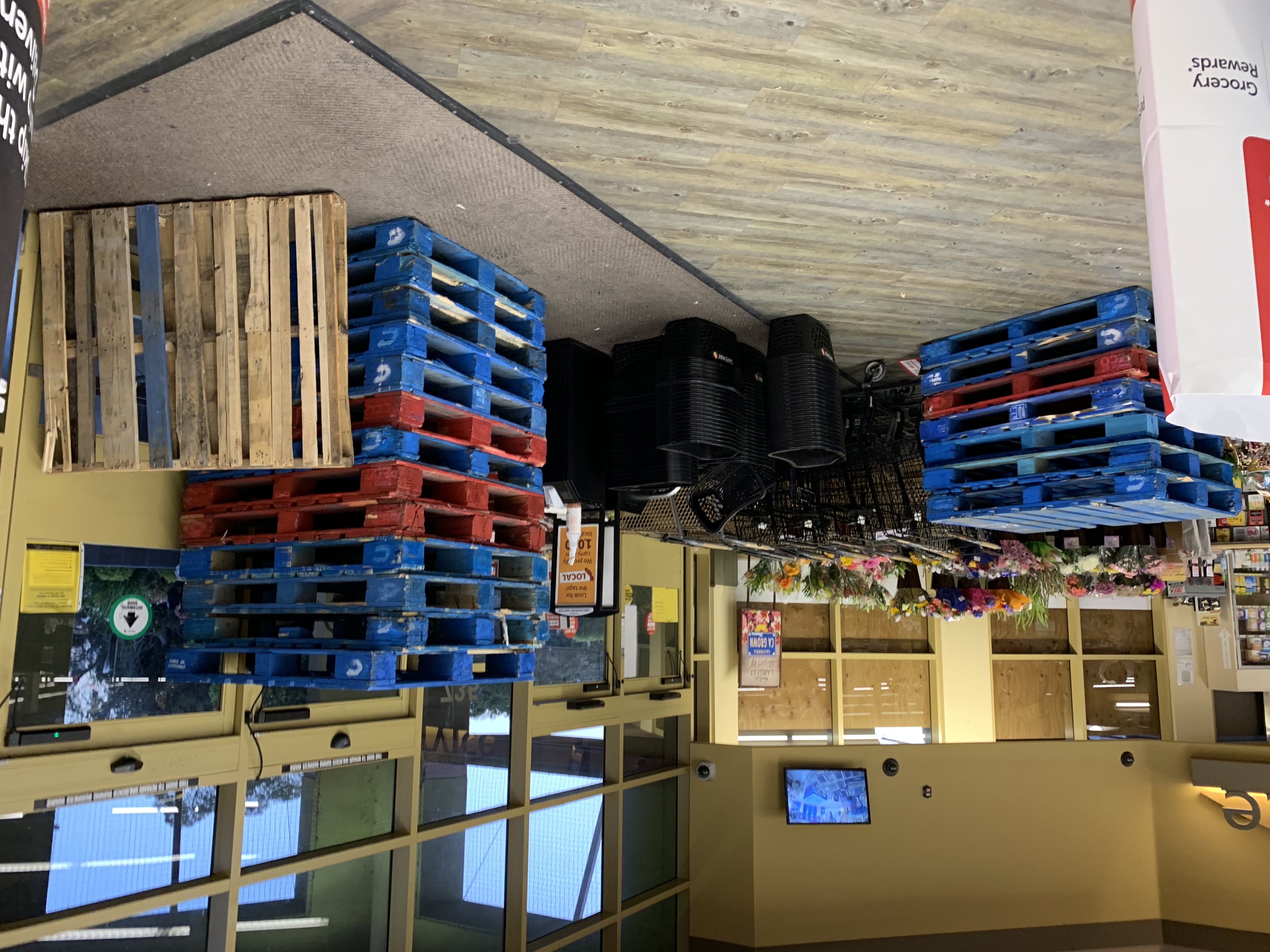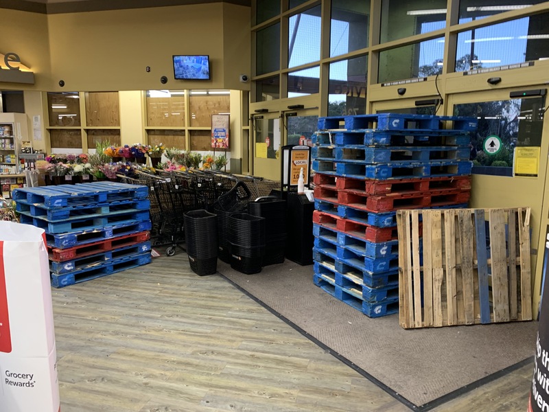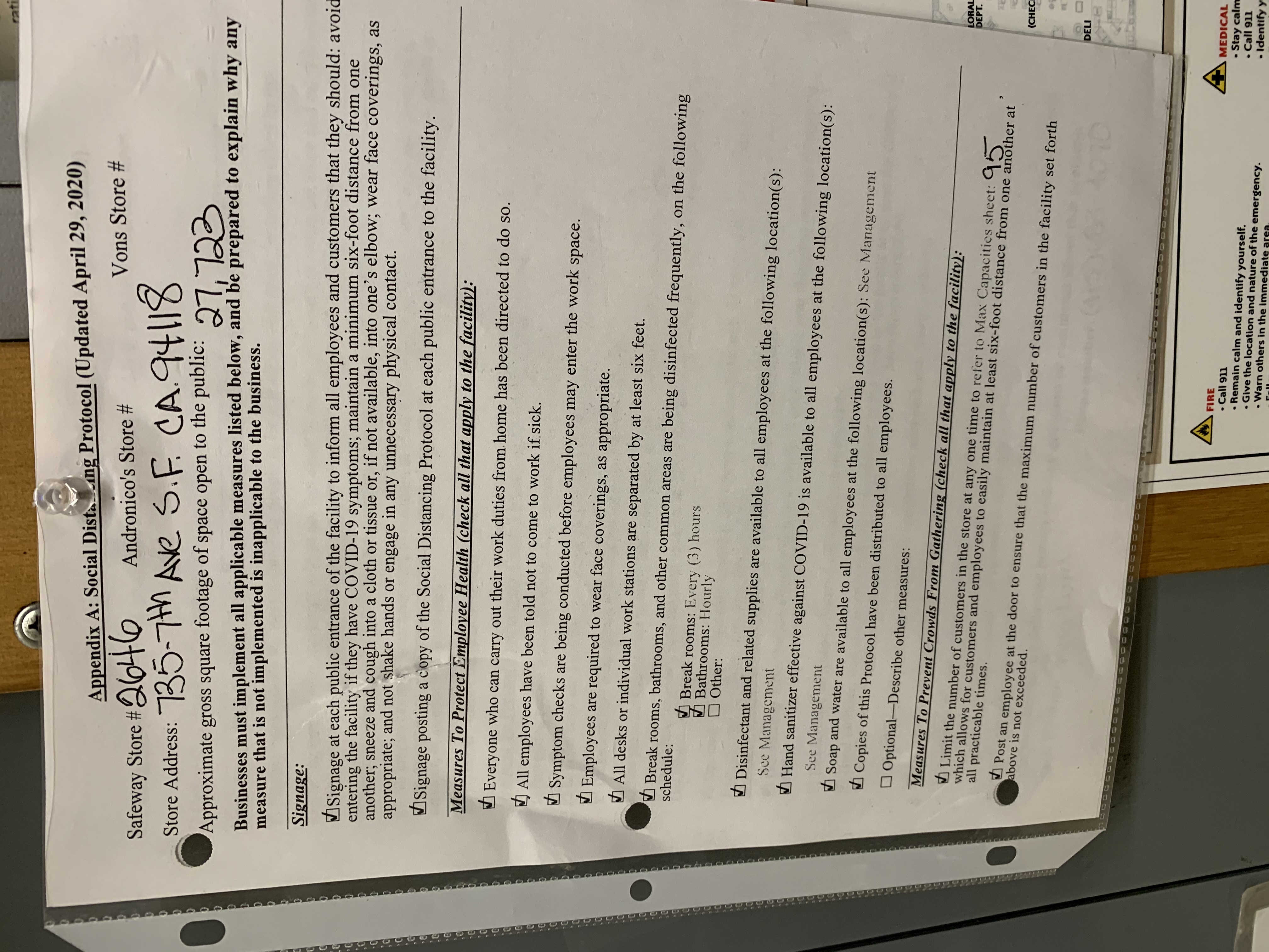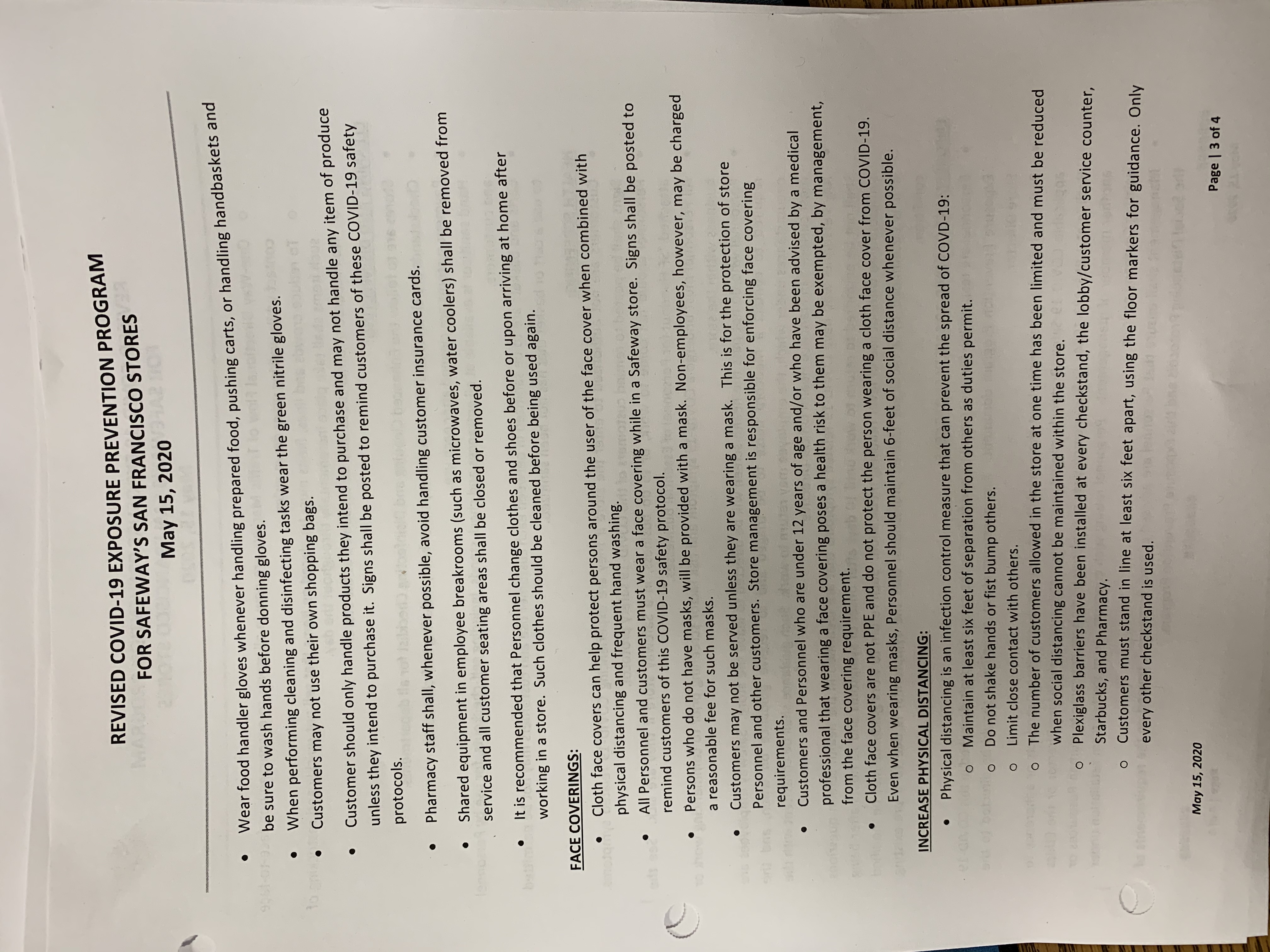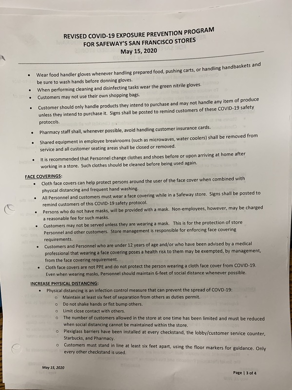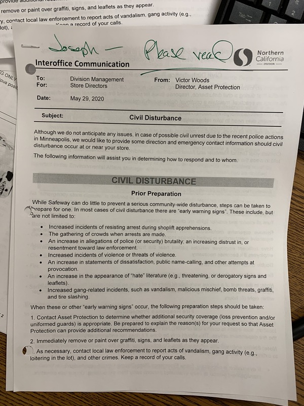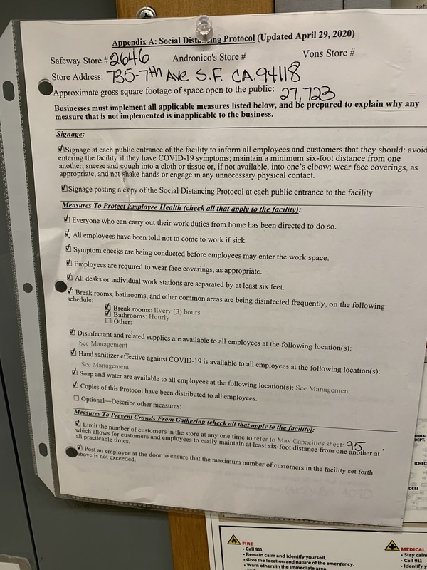 These photos portray the heightened social and political tensions that occurred after George Floyd's death. Systematic racism, marginalization, and police brutality sparked an increase in civil unrest, resulting in a mandated curfew in San Francisco. Floyd's tragic death caused rioting, protesting, and looting nationwide, concurrently taking place during the worsening pandemic of COVID-19. As many businesses closed their doors, many closing for good, few essential businesses such as Safeway stayed open. Strict policies in regards to wearing faces masks, social distancing as well as more intensive cleaning measures, were enforced to ensure the safety of the community at large. In short, the photos of store policies depict the rapid changes that were implemented in response to COVID-19. The rest of the photos show how our store took cover during the intense rioting that spiked in late May and early June. A few depict the aftermath of the looting at a local Safeway branch; the store that I worked at was not unscathed in the looting scene. I hid with a couple of employees in the manager's office, on the phone with police, as people broke in. This is just a small glimpse into a larger event that reverberated nationwide, sparking massive outcry, and hushed voices to rise as many sheltered during this pandemic.