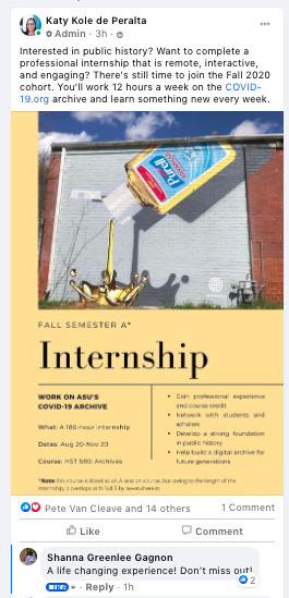 I started off with 9 students enrolled in the fall internship. This internship is open to ASU history graduate students. Yet, slowly that number dropped down to four. I’m not sure why. I don’t think that there’s a better opportunity out there right now. Nowhere else can you complete a remote internship on the scale of the COVID-19 archive. This archive is magnanimous, it’s important now, but it will be remembered as a watershed moment in public history projects.