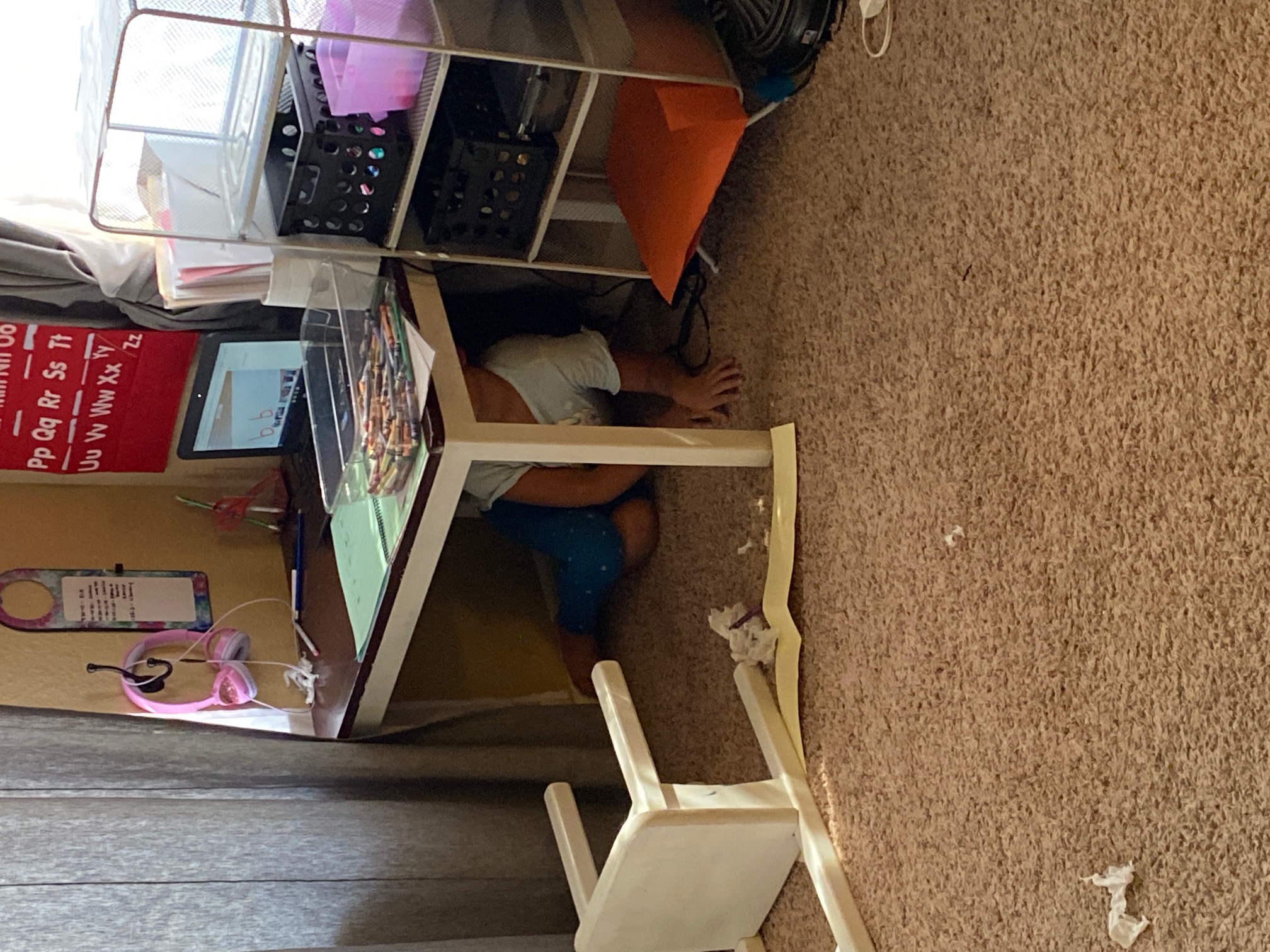 After a few days of online schooling, my daughter had a breakdown. She was trying her best and feeling frustrated. Her breaking point was finally accomplishing her task and not being able to get her teachers attention because of technical difficulties. Her teacher was congratulating all her classmates and recognizing their work but she didn't. She felt defeated and wanted to quit. I tried to console her and blamed the computer and not her teacher. She then decided to crawl under the table and cry of frustration. This picture is important to me because it describes how remote learning is going in our home. I have tons of pictures of her in front of the computer doing well in class, but this is a moment that happens a lot that I rarely document. My daughter knows she cant go into school because of Covid and understands as much as her five-yar-old brain can but she is without a doubt struggling. This photo reminds me that children are suffering just as much, if not more, than adults are during this challenging time.