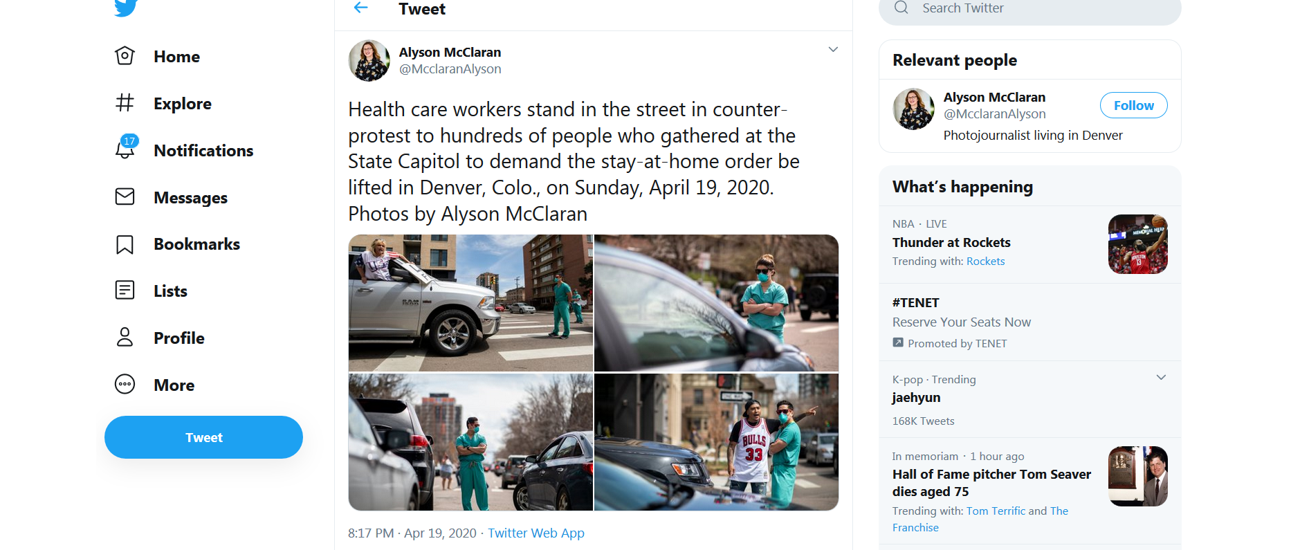 The photo shows nurses blocking an anti-lockdown protest in Denver. This picture is one of many photos taken the afternoon of April 19th, 2020. The protesters argued that they should be able to go out and get haircuts, have a drink at the bar, eat at a restaurant, and so on. The protesters argued that the mandatory stay-at-home and wearing of face masks went against their constitutional rights. One woman held up a sign saying, “land of the free” and shouted “This is a free country. Land of the free. Go to China if you want communism.” All the while the nurses stood silently in the cross walks during red lights in their scrubs and N95 masks, trying to show the effects and severity of Covid-19. This photo shows a mere glimpse of the anti-lockdown protests. The contrasting arguments of personal health vs. public health