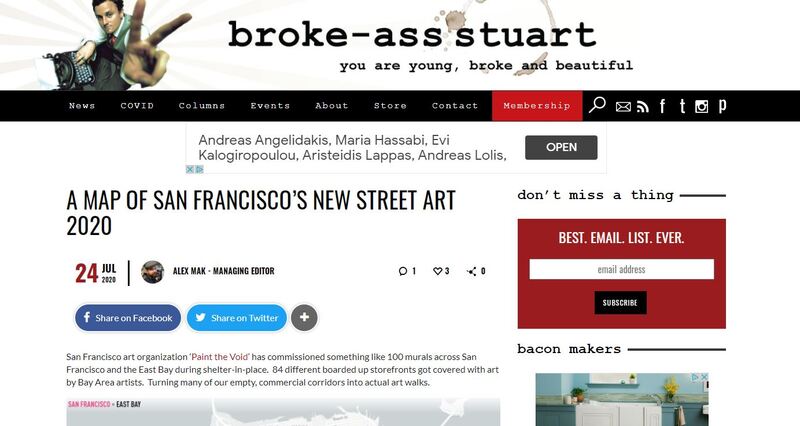 Street art has proliferated across the San Francisco Bay Area in the wake of the COVID-19 pandemic. News outlet, Broke-Ass Stuart, featured a map of the street art that is popping up in San Francisco's public spaces. As the article states, the art is "turning many of [San Francisco's] empty, commercial corridors into actual art walks." The specific map highlights art created by artists involved in the Paint the Void initiative.