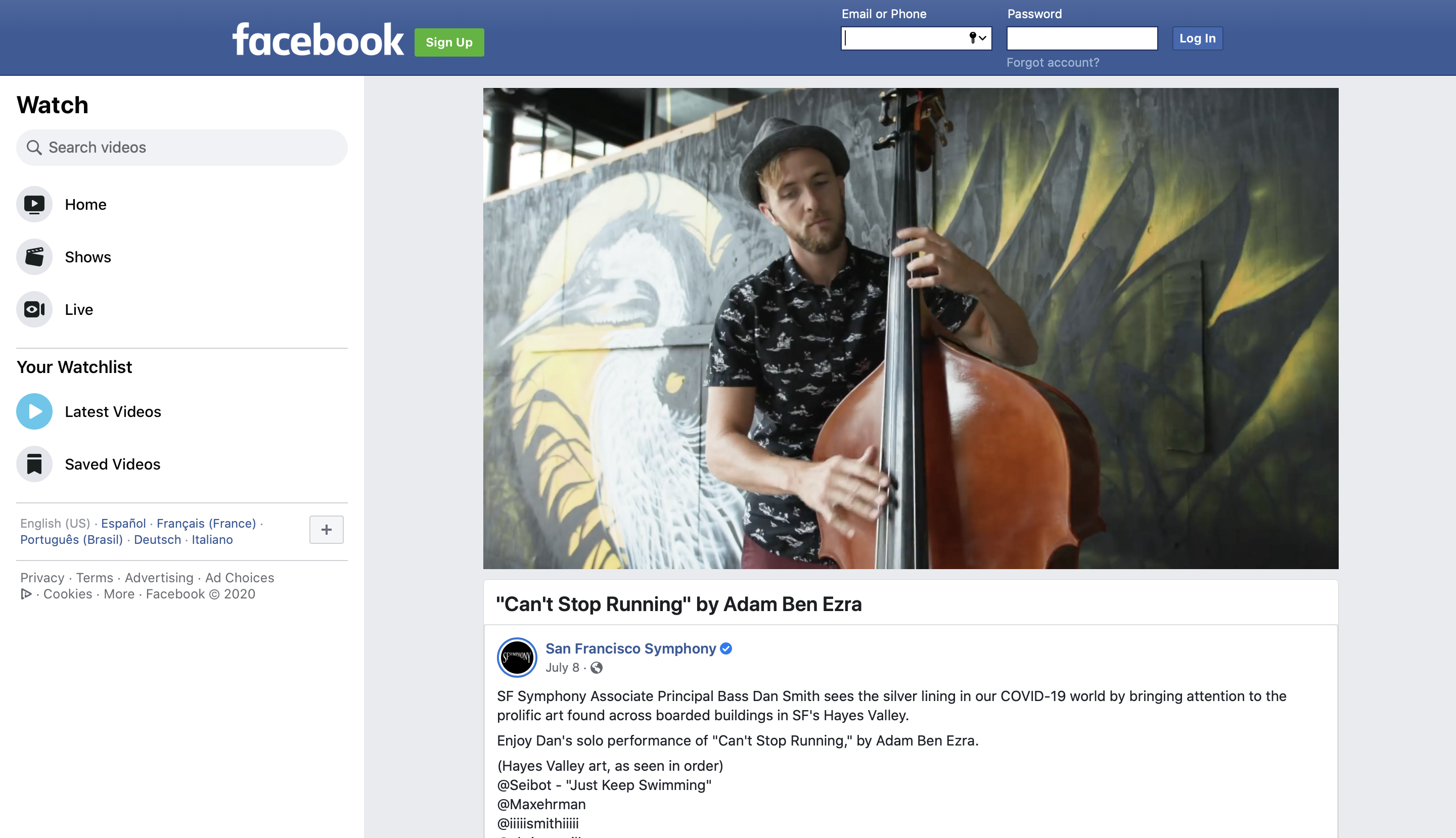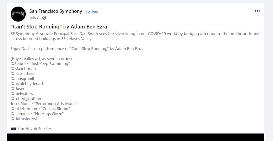 A regional street art movement is bringing life and culture to San Francisco's empty streets during the COVID-19 pandemic. SF Symphony Associate Principal Bass, Dan Smith, is contributing to the movement by adding sound. In this video, Smith plays Adam Ben Ezra's "Can't Stop Running" in front of a variety of street art installments in San Francisco's Hayes Valley. As a former San Francisco resident, the sound produced by Smith, coupled with the art, feels exactly like the "City by the Bay." Art and culture are the heartbeat of San Francisco. And they remain alive and well during the COVID-19 pandemic.