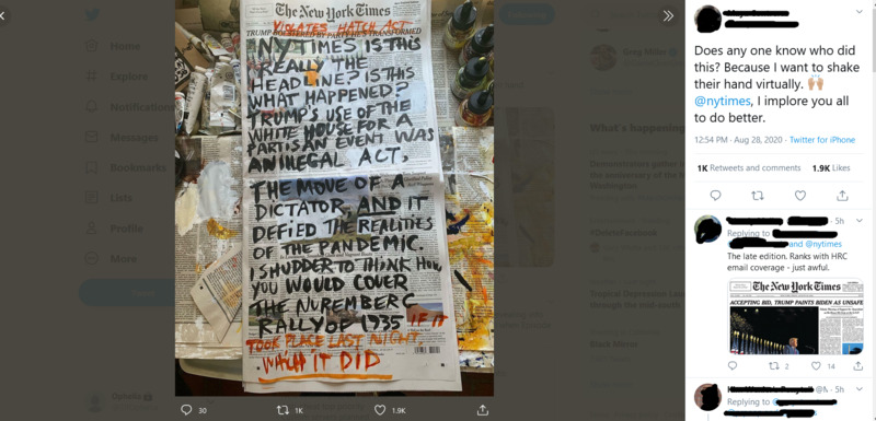 I saw this post on Twitter from an user who is looking for the original creator the corrected NYT headline photo. Trump blatantly violated the Hatch Act by holding a portion of the RNC at the White House. In addition to this illegal act, organizers did not promote proper social distancing at the event and many people were present without masks and in close proximity to each other. The NYT failure to accurately report the situation is irresponsible as it lends credibility to an illegal act and a dangerous situation.