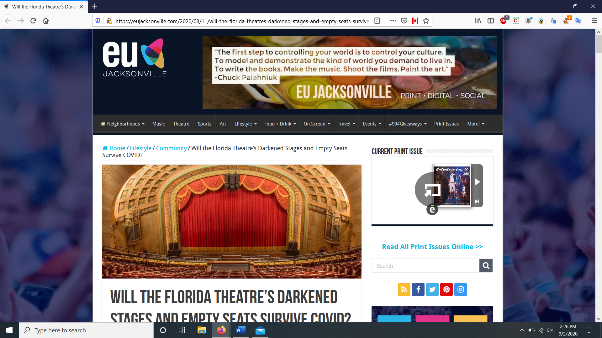 One of the oldest performing arts venues in Jacksonville, Florida, is the Florida Theatre, which over time has been an opera house, a movie theater, and a venue for concerts and plays. Even though under Florida law, they can reopen at 50% capacity, the layout of the theater is so small they could only operate at 25% capacity to maintain social distancing. Because of this, they have to remain closed as 25% capacity is not financially viable enough to open the theater. The Florida Theatre is a building rich in local history, and in the past they have stayed open to the public because of the concerts they host. Not only that, it is a major local employer, employing people directly and also contracting work from other local businesses.