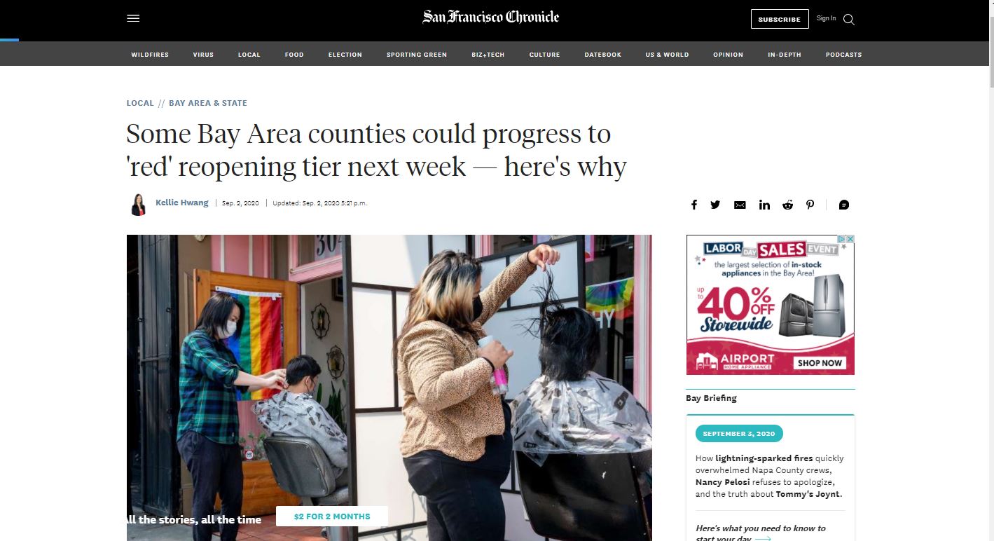 As California moved from the "watch list" system to a "color-coded tiered" system, San Francisco Bay Area businesses are still navigating re-opening plans. Only 2 counties in the Bay Area are currently in the "red" zone which allows for some non-essential businesses to re-open. All others are currently in the "purple" zone. While the time frame and requirements to re-open continue to create confusion across the region, San Francisco hair saloons were able to operate outdoors for the first time since March shelter-in-place orders. Aside from the important re-opening information in this article, the image of hair stylists operating outside of their establishment in San Francisco, with Pride flags displayed proudly in the salon's windows, caught my attention. While life as we knew it has completely changed in the San Francisco Bay Area, this image feels very "San Francisco" to me. I am curious what aspects of the COVID-19 world will stick with us long after the pandemic is over. Will some businesses, like hair salons, continue to offer outdoor services?