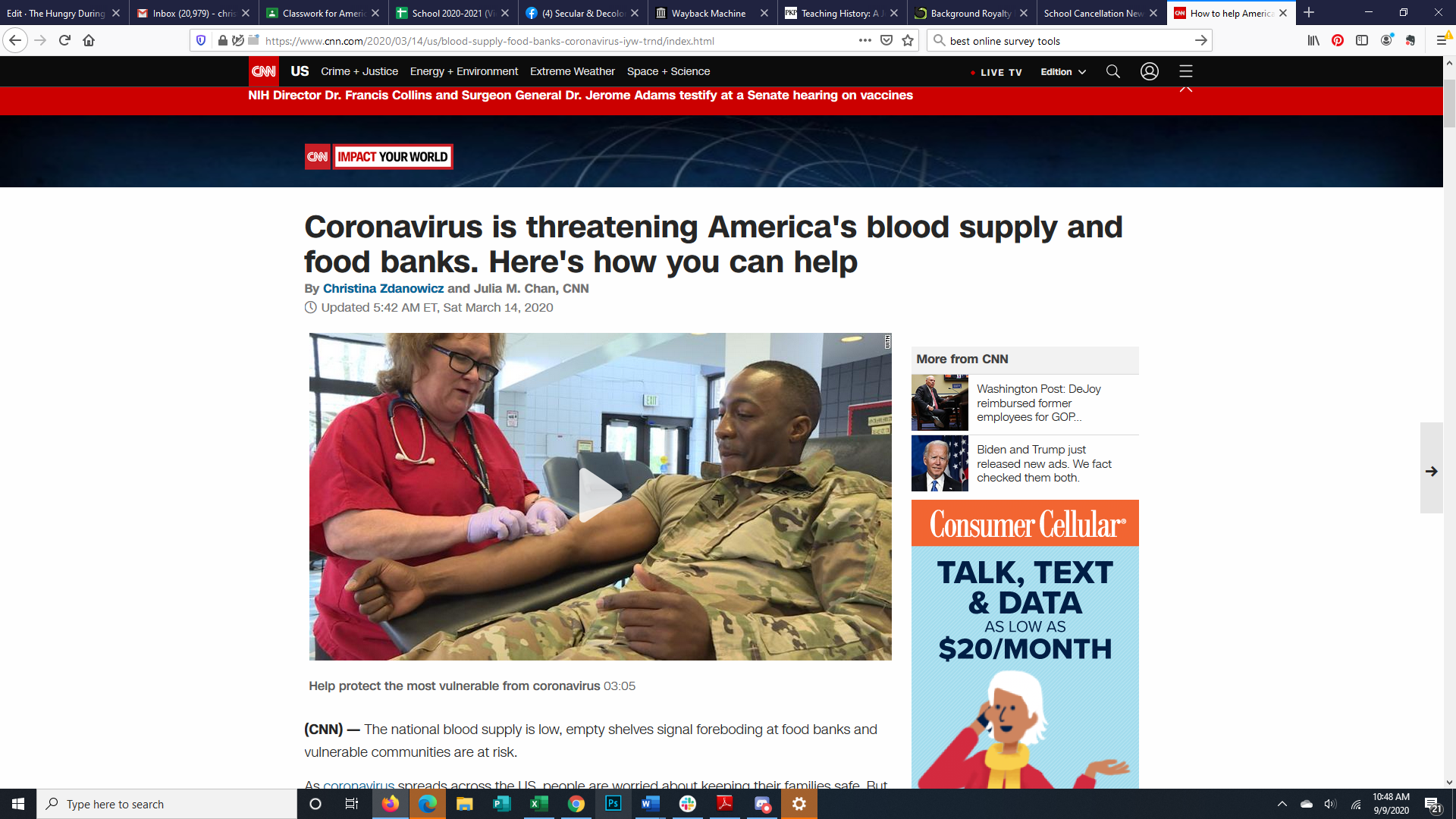 This is a photo that I found on CNN of one of the shelves in a food bank. The amount of people that are relying on food banks has drastically changed since the begging of the pandemic to now. From the pandemic, Feeding America predicts that an estimated 1 in every 6 Americans may face hunger due to the conditions. This photo made me think how fortunate my family and I are and how lucky we are that we don’t have to be concerned with where our next meal is coming from. I think that this Is an important photo because it shows how many people are in need of food and are unable to support themselves. since more people are out of jobs because of not being able to come in contact with other people has affected the income of many and the amount they can spend on food.