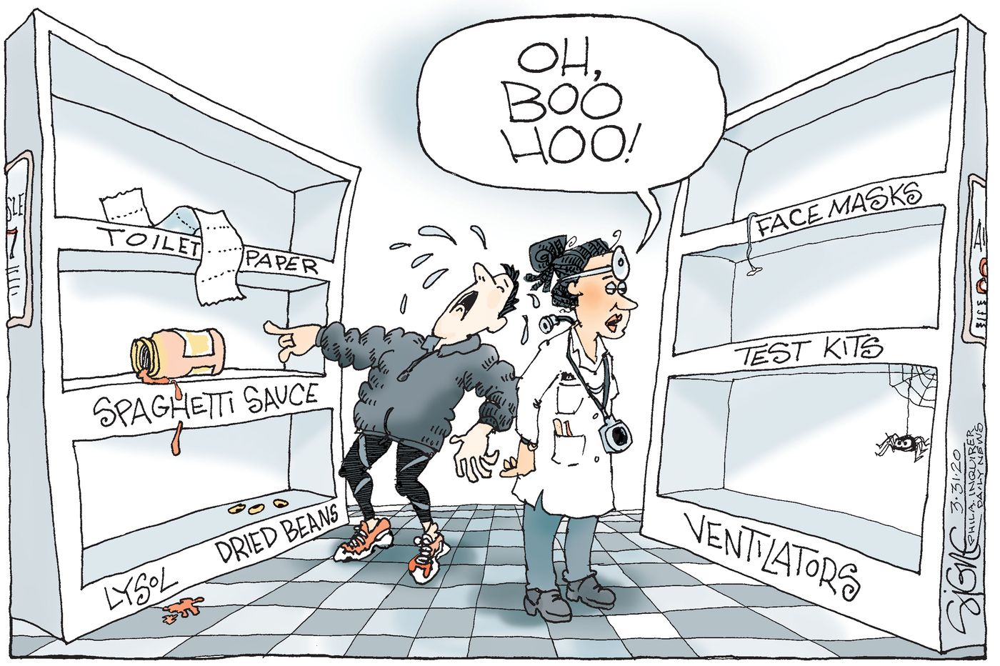This comic shows how much of an impact the coronavirus had on grocery stores and shoppers. It also shows how people could have overreacted to the fact that they can't find toilet paper or foods like spaghetti sauce. The main focus of this comic though is the doctor who is looking at the other row of shelves. The shelves are labeled, "face masks," "test kits," and "ventilators." This shows how not only food was a shortage, but also very important medical supplies that were needed to keep people alive. This is important to me because it shows the different struggles between everyday necessities, and what people need to stay alive.