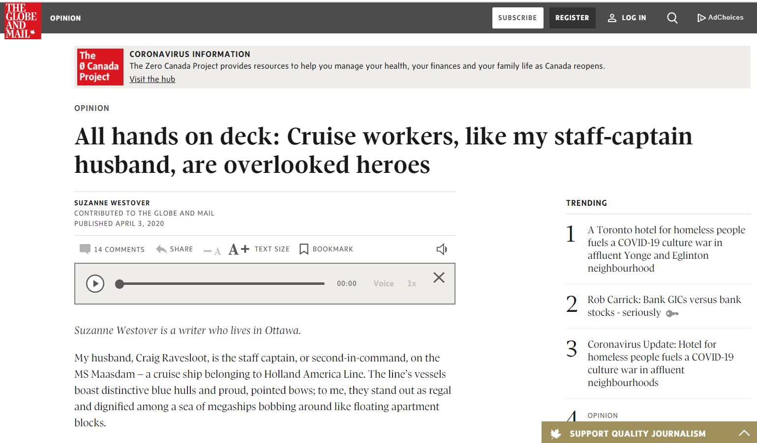 The cruise industry is a tight-knit group, where it seems like everyone knows everyone else. The Covid-19 pandemic blindsided the industry, which was unprepared for how quickly Covid-19 would spread across the globe and amongst ships. Covid-19 stressed all health and sanitation protocols the industry at large had in place. This lead to some dire circumstances and a humanitarian crisis with Covid-19 outbreaks aboard cruise ships adrift at sea where they were denied port entry in numerous countries around the world. The following article is an appeal for help written early on in the crisis by Suzanne Westover, wife of Holland America Line’s Staff Captain Craig Ravesloot. Herself a former crew member, Suzanne uses her platform to remind the world that the onboard crew was working round the clock to protect the health and wellbeing of passengers. Her friends and colleagues at sea needed help, the situation was dire, what would we do if in the same position?
