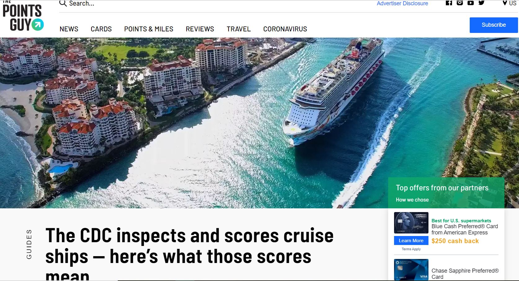 Cruise ships are bustling cities. Lido decks are a din of conversation over food, and while most cruise ships suspended buffets years ago, passengers still share access to, among others, refillable water stations, cookie baskets, and salt and pepper shakers. Tables are close together and guests stand closely in line. While hand sanitizer stations are dotted throughout common areas, cruise ships with so many people in such close quarters, are difficult places to prevent the spread of aerosol, airborne virus’ like Covid-19. Now that cruise ships, and world health organizations, have had time to assess the risk they are developing new protocols to help making cruising possible again when it is safe to do so. The United States’ Centers for Disease Control and Prevention developed the Vessel Sanitation Program, which is now shifting to include Covid-19 health protocols. Ships receive a surprise inspection from the CDC where they evaluate the following areas: medial facilities, potable water systems, swimming pools and whirlpool spas, galleys and dining rooms, child activity centers, hotel accommodations, ventilation systems, and common areas of the ship. At The Points Guy blog, they outline how the program works and how future cruisers can use the CDC data to inform the health and safety of their future vacation.