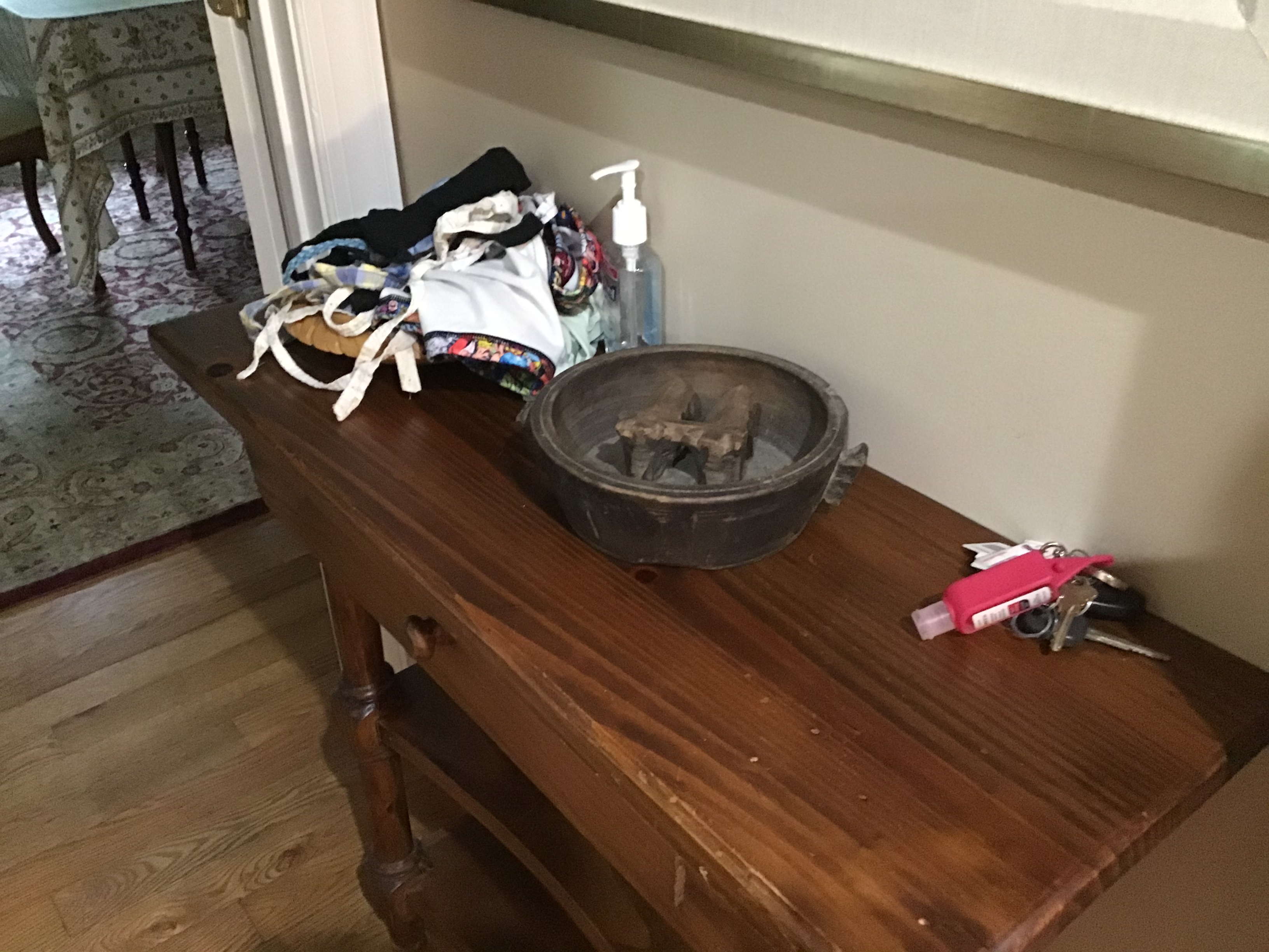 Note the overflowing mask bowl next to the car keys and hand sanitizer. This illustrates the new protocol for leaving the house, which now means grabbing a mask as well as your phone and car keys. To me, this speaks volumes about the way the pandemic has affected daily life and our routines and what we consider “normal” to be