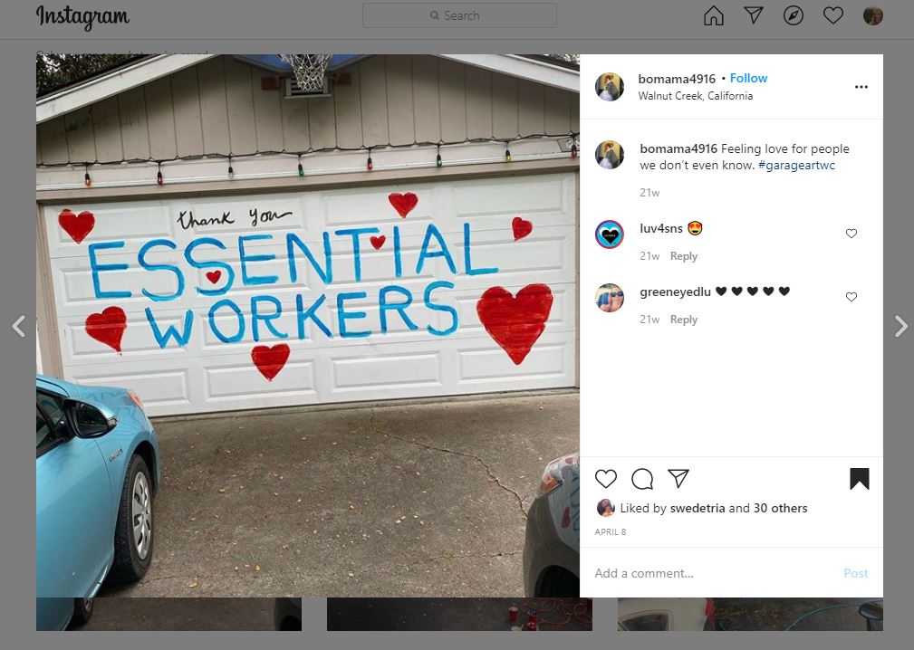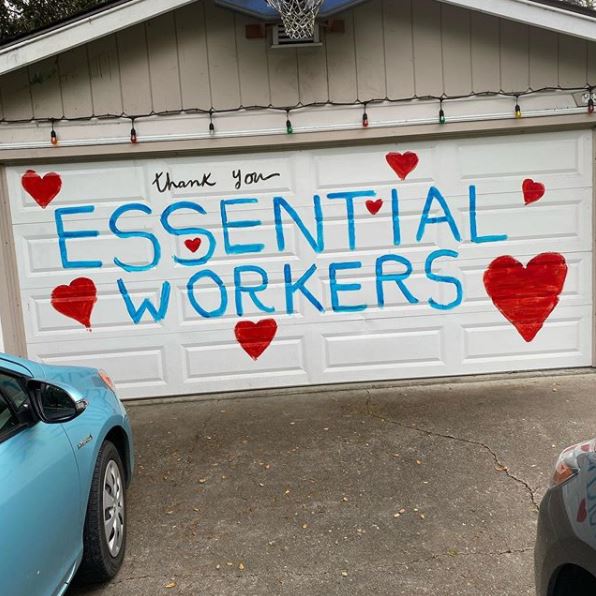 A family in Walnut Creek is using their garage door to send various messages during the COVID-19 pandemic. This message reads "Thank You Essential Workers." The art has been a source of community, inspiration and hope for Walnut Creek residents.