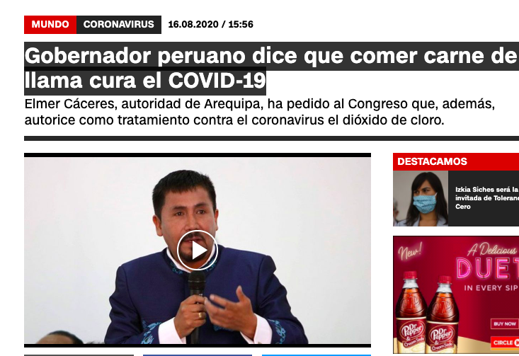 The recipe of lama meat and chlorine dioxide to combat COVID-19 has no backing. The governor Arequipa (Peru), Elmer Cáceres, is now asking to receive the Russian vaccine after the Peruvian government relieved him of his duties from the Department of Health Administration.