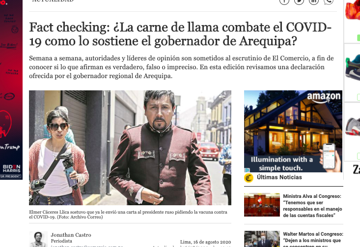 News article from EL Comercio that fact checks the statemet from Arequipa's governor: “El consumo de alpaca y llama combate el coronavirus. Está comprobado científicamente que combate al COVID-19”. A number of different solutions have been proposed to combat COVID in Peru, but the idea of eating llama meat is one of the strangest.