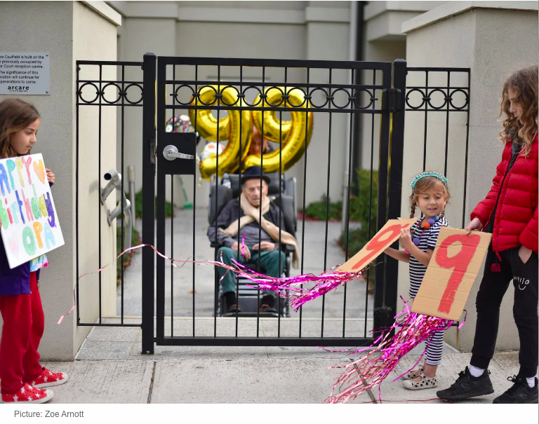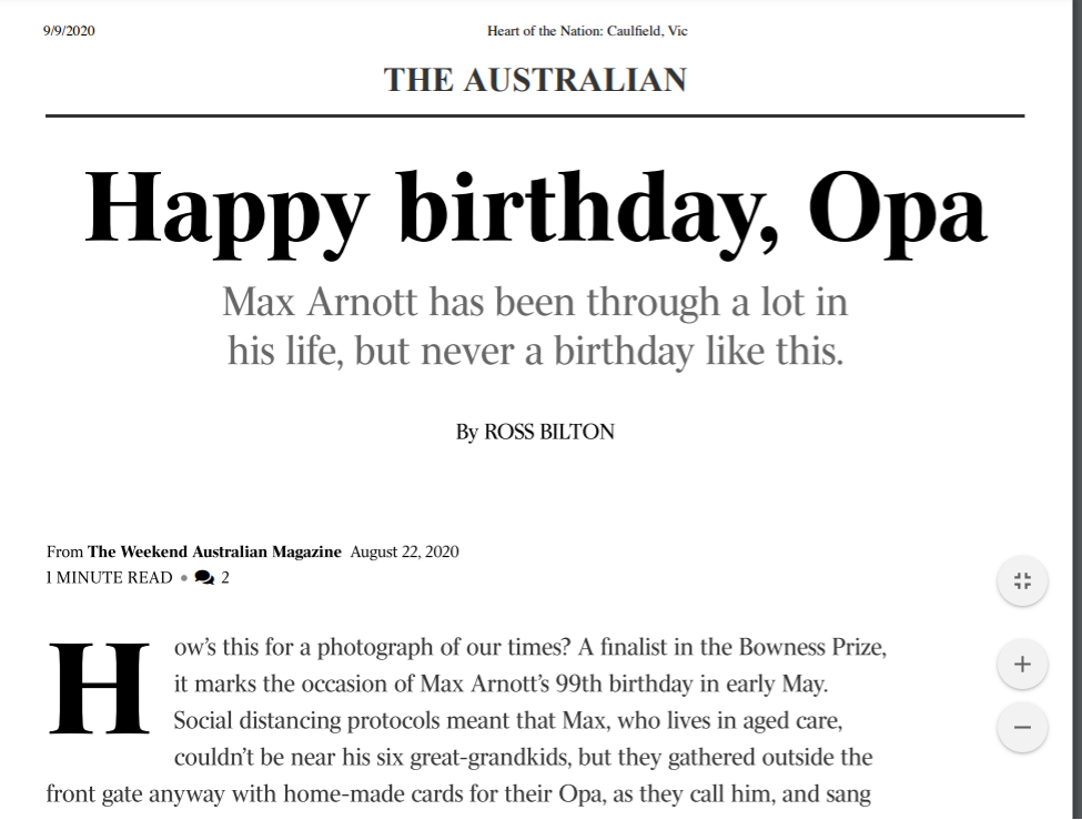 This article appeared in The Weekend Australian Magazine, marking the 99th birthday of Max Arnott, a Dunera Boy, which happened in May, under Melbourne's lockdown. Max's granddaughter, Zoe Arnott, took a photo of three of her children outside Max's gate, celebrating his birthday.