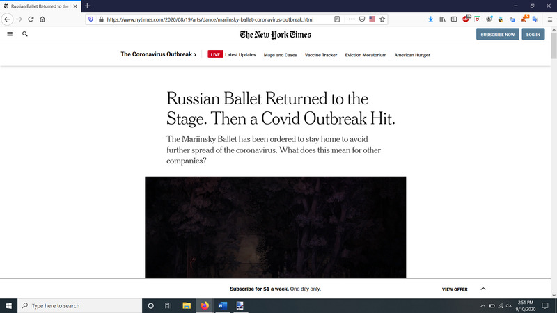 This article discusses the Mariinsky Ballet, one of Russia's premier ballet companies. As Europe is a bit ahead of the United States in reopening their performing arts, they began performing in July, in the middle of the COVID pandemic, only to have to close three weeks later when the virus spread throughout the ballet corps. Since then, the Mariinsky Ballet has been criticized for returning to the stage too early, despite the precautions they made against the virus. This incident has caused several other ballet companies across Europe to rethink their own return to the stage. In spite of these issues, many dancers are also wanting to return to the stage.