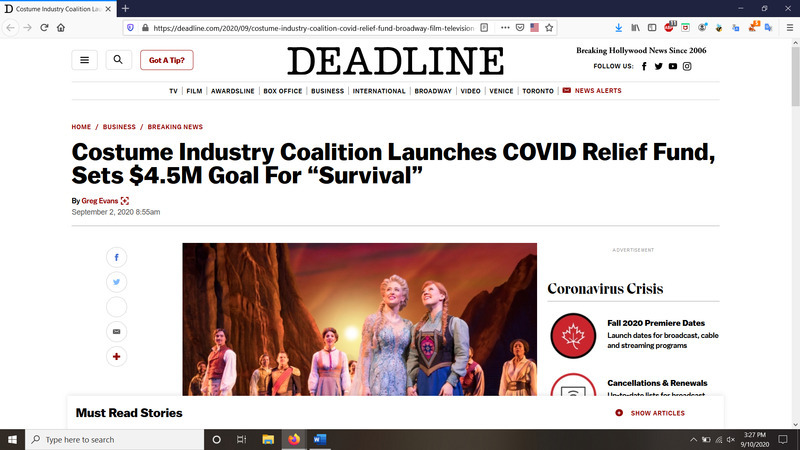 This article speaks to the dire straits the costume industry is in due to the COVID-19 pandemic. Many of these costume shops have been closed since March 2020. This affects not only Broadway, but also Hollywood, the television industry, and other performance industries. The Costume Industry Coalition, a newly created organization for the pandemic relief of the costume industry, has estimated that they need to raise $4.5 million in order to keep costume designers' shops open.