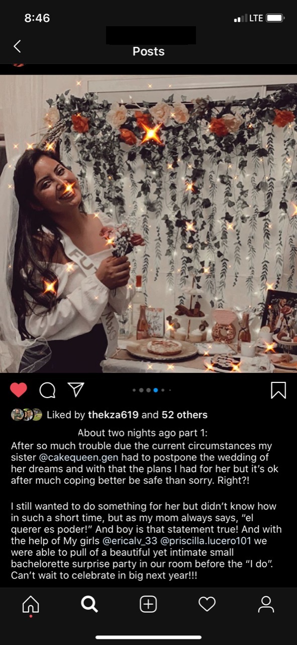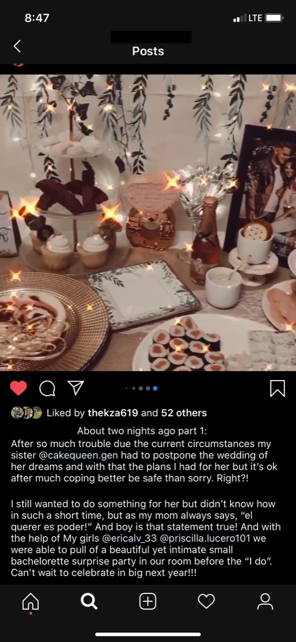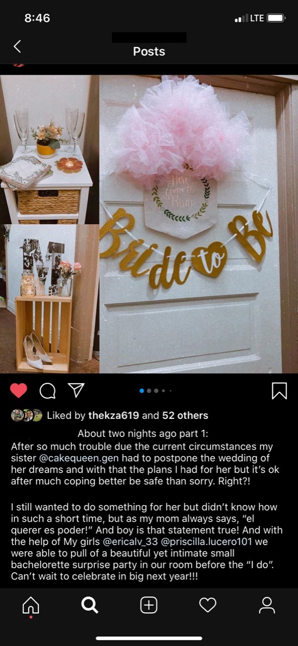 A friend of mine had to postpone her wedding after almost a year of hard work and planning. The couple had announced that they would wait to have the wedding of their dreams until it was safe to do so. This week her sister uploaded a surprise bridal shower she hosted in her tiny bedroom for her sister and bridal party. I wanted to show how people are still living during Covid, people are still celebrating, and love is still winning. I thought it important to shed some light amidst all the negativity and darkness that Covid has brought. I thought it was the sweetest gesture to let this bride feel important and acknowledging this big event in her life. A few days after this bridal shower, this bride went down to the courthouse and married her best friend. They are still planning to have a big celebration next year.