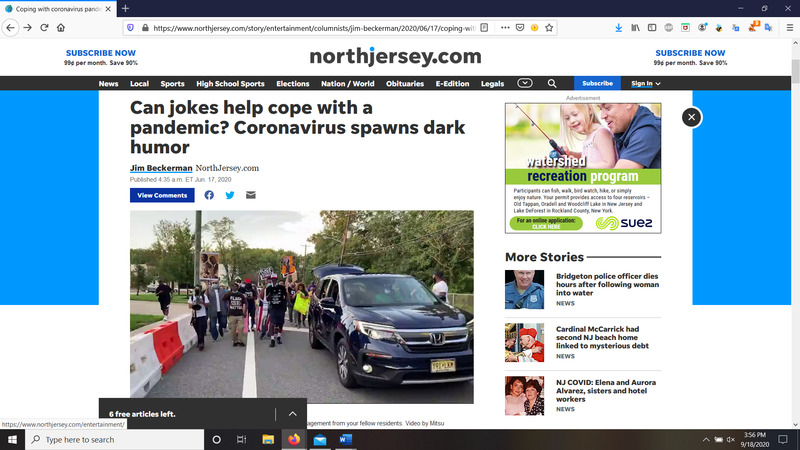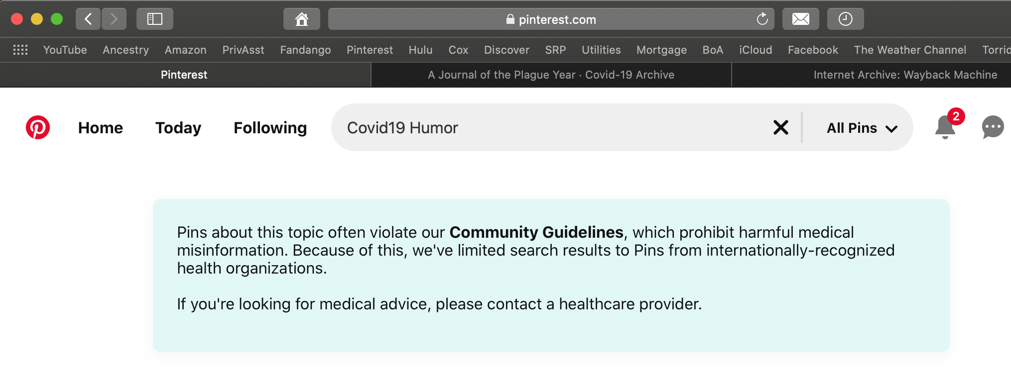 While looking for items to submit to this archive, I tried searching Pinterest for some humorous memes to add. After reading a lot of heavy articles, i felt a little humor was in order; only to be thwarted by Pinterest. After searching for "Covid19 humor, I received a message saying that pins relating to this topic often violate community standards guidelines and so, results were restricted to established health organizations... I guess gallows humor is not for everyone... I tried a google search for the same search term and came across a few things but this article stood out. It discusses the rise of 'dark' humor and how it can, in some cases, actually help those trying to cope with difficult subjects. It confirmed my suspicions that those of us who have a 'gallows humor' approach may have been on to something all along.