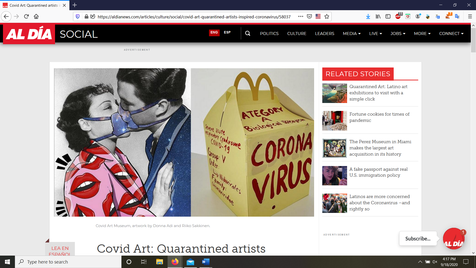 This article posted by Al Dia about Covid Art and a virtual museum in Barcelona, Spain, where a collection of covid art can be viewed. The collection consists of illustrations, photographs, paintings, drawings, animations, video, etc. According to the one of the publicists, these pieces of art reflect how we are all living and feeling during the pandemic. Art has always reflected what was going on during that time period. #covidart, #pandemic, #virtualmuseum, #quarantine, #Barcelona (HST580, Arizona State University)