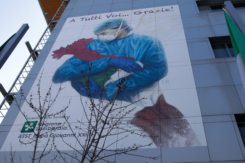 A giant graffiti depicting medical staff holding a figure shaped as a boot representing Italy and reading " To you all… Thanks", is painted on a side of the Brescia hospital, Italy, Monday, March 16, 2020.