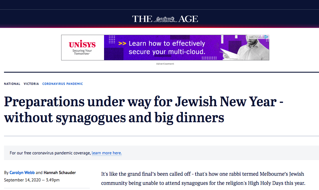 Jewish Melbourne: article in The Age - "Preparations under way for Jewish New Year - without synagogues and big dinners"