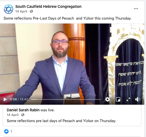 On 14 April 2020, Rabbi Daniel Rabin from South Caulfield Hebrew Congregation recorded a livestream from the shul with "Some reflections pre last days of Pesach and Yizkor on Thursday." This video was streamed to facebook, where it remains.