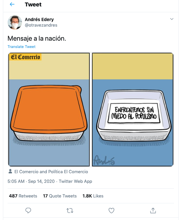 Otro dibujo hecho por Andrés Edery, indicando que la gente de Peru ya están lista para un sistema populismo. Publicado en el periódico El Comercio. Edery publicó su dibujo en Twitter después de que se publicó en El Comercio.