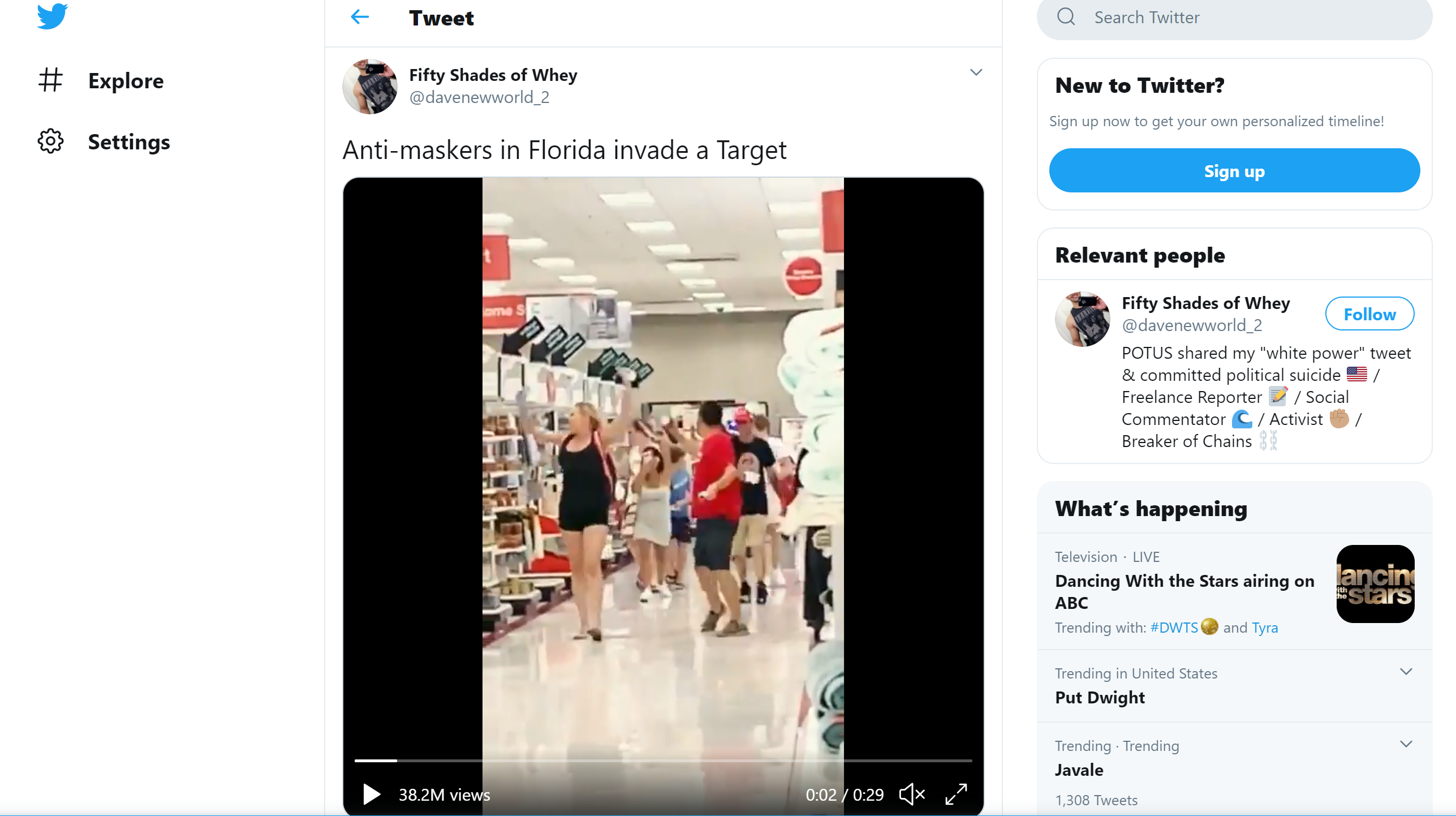 The video shows a group of people protesting masks in a target in Florida. The protesters can be heard saying, "Take it off" and were playing "We're not gonna take it" by Twisted sister on a speaker.