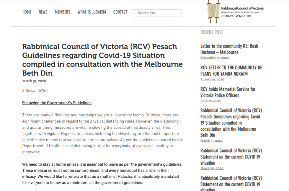 Jewish Melbourne: ' Rabbinical Council of Victoria (RCV) Pesach Guidelines regarding Covid-19 Situation compiled in consultation with the Melbourne Beth Din'
