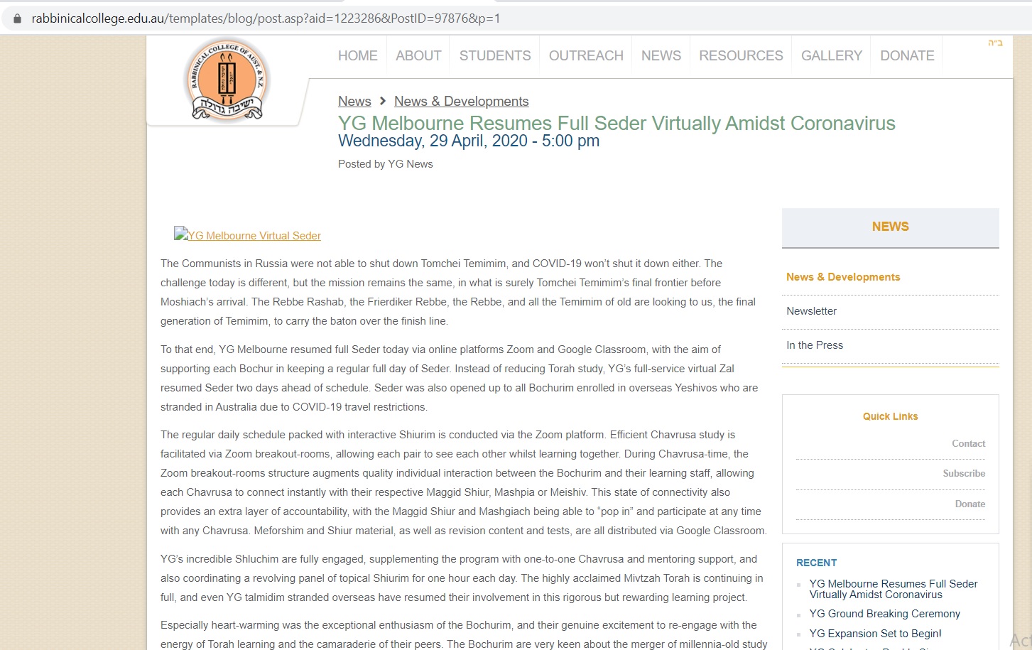 Jewish Melbourne: 'YG Melbourne Resumes Full Seder Virtually Amidst Coronavirus'