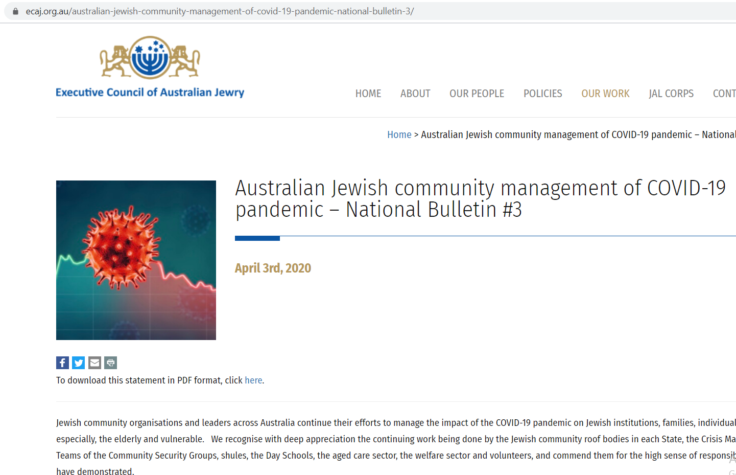 Jewish Melbourne: Australian Jewish community management of COVID-19 pandemic – National Bulletin #3
