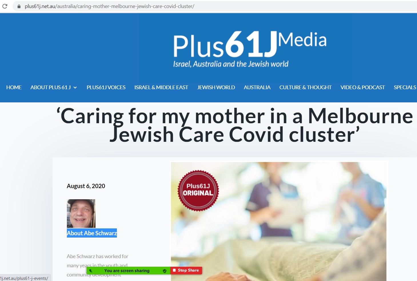 This is an article written by Abe Schwarz and published in +61J Media in which Abe writes about the experience of his mother being in "Monte", the Jewish Care home in St Kilda rd, and their experience of the lockdowns during Covid times.