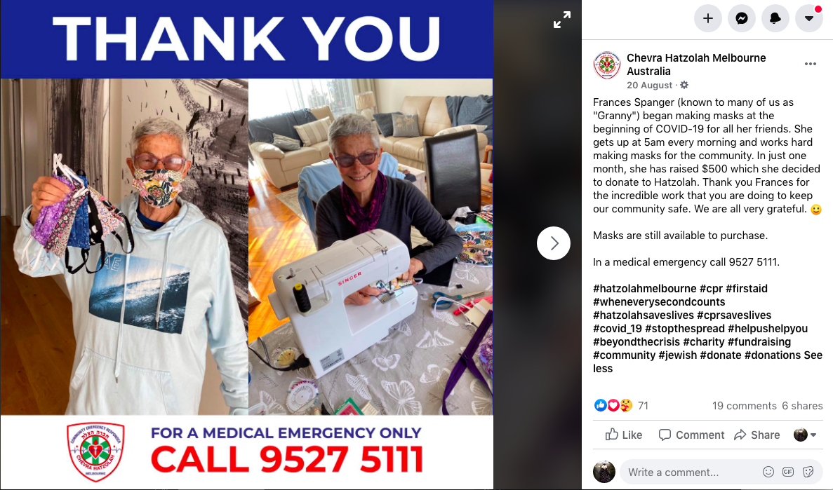 This is a facebook post by Chevra Hatzolah, including a photo and the words: "Frances Spanger (known to many of us as "Granny") began making masks at the beginning of COVID-19 for all her friends. She gets up at 5am every morning and works hard making masks for the community. In just one month, she has raised $500 which she decided to donate to Hatzolah. Thank you Frances for the incredible work that you are doing to keep our community safe. We are all very grateful."