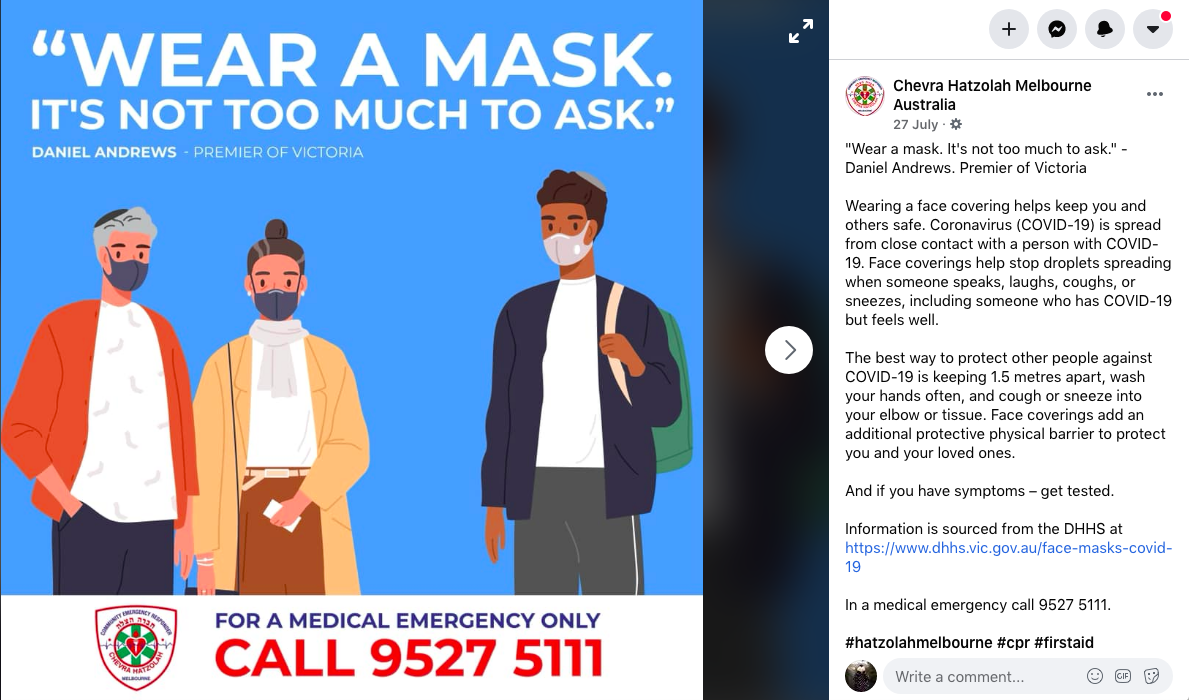 facebook post by Chevra Hatzolah encouraging people to wear masks: ""Wear a mask. It's not too much to ask." - Daniel Andrews. Premier of Victoria