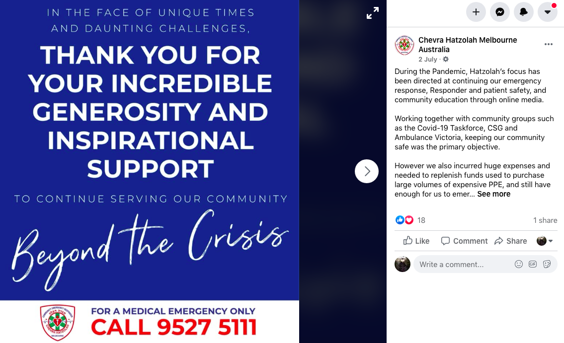 Facebook post thanking people for their contribution to the Chevra Hatzolah 'Beyond the Crisis' fundraiser. The post says: "During the Pandemic, Hatzolah’s focus has been directed at continuing our emergency response, Responder and patient safety, and community education through online media.