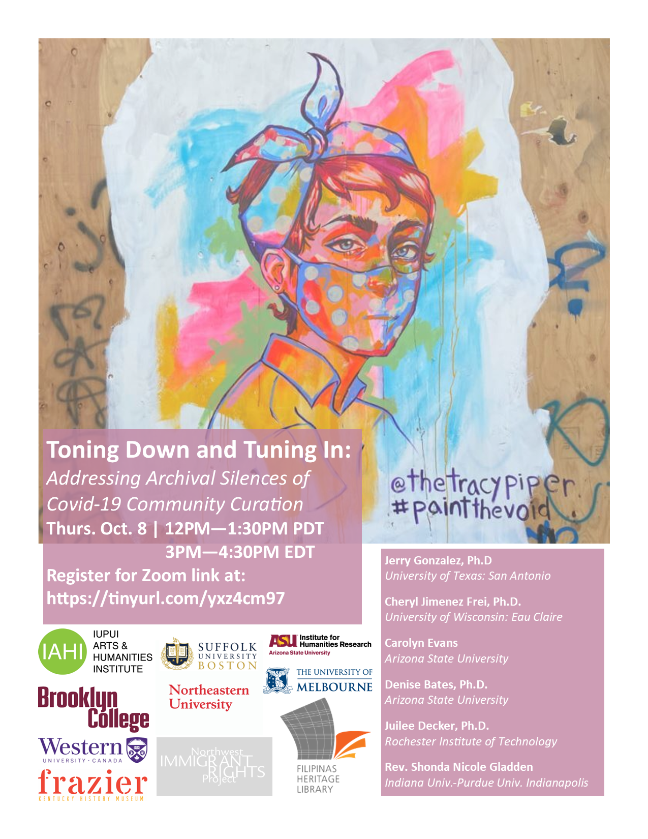 This workshop will include short presentations by a panel of experts and JOTPY partners, such as UTSA historian Jerry Gonzalez, UW Eau Claire Historian Cheryl Jimenez-Frei, JOTPY Intern Carolyn Evans, Rochester Institute of Technology Museum Studies Director Juilee Decker, and ASU sustainability scholar Denise Bates, and Rev. Shonda Nicole Gladden whose work on underrepresented groups exposes silences in the archive and within the Covid-19 pandemic more generally. Discussion and Q&A will follow. This is a great opportunity for educational communities to discuss how Covid-related social issues are magnified and replicated by community collection and curation.