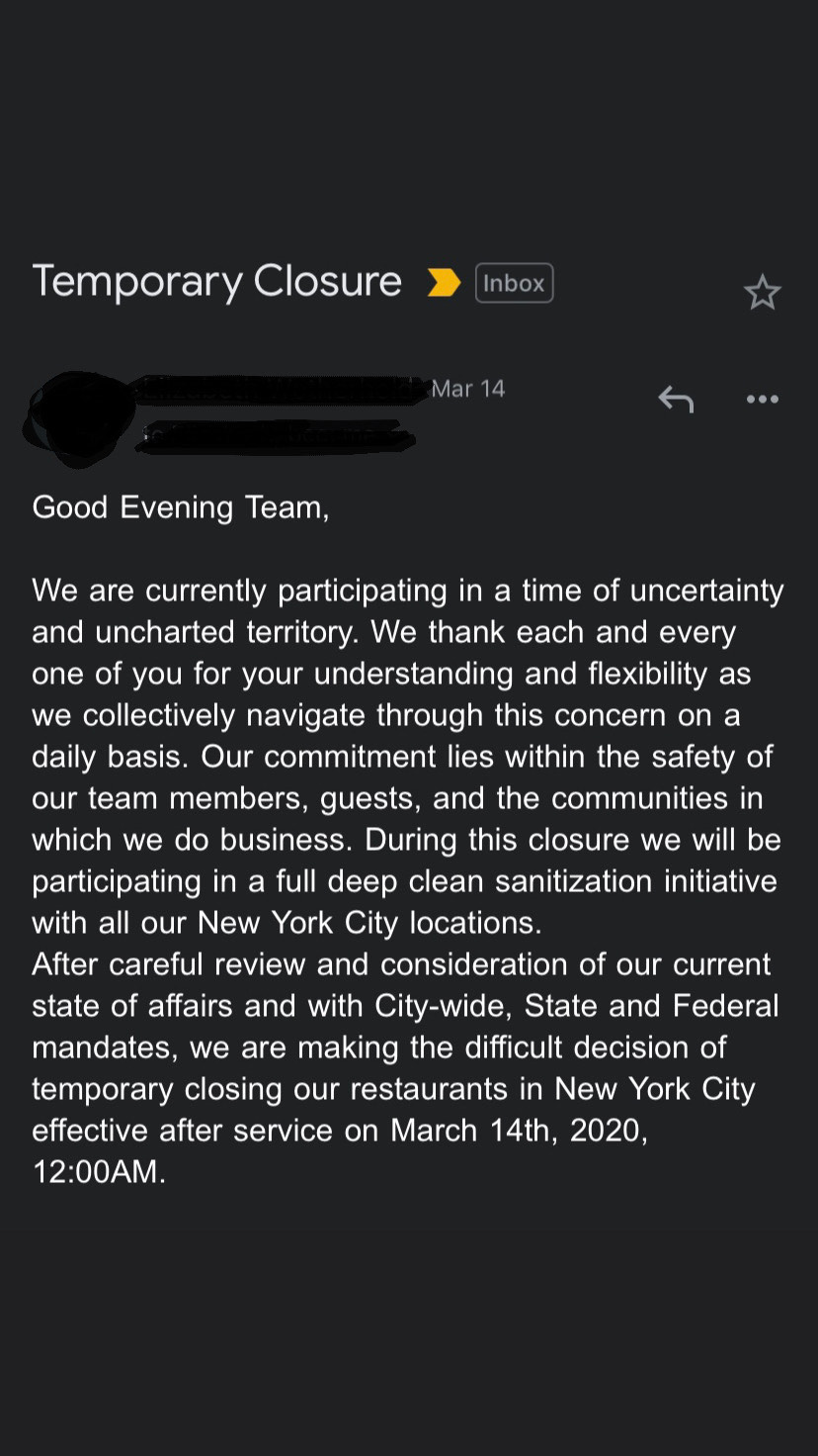 March 14. That was the date everything became real. COVID-19 had personally reached my life. My restaurant, my livelihood was gone and I found myself scared for my safety, my well being and I wondered how I was going to survive this pandemic with no income. My family and loved ones were in Los Angeles, CA, my birthplace. They all encouraged me to "come home" but I vowed to stay in New York, the place I had been calling home for the previous three years. Once I received the email from the general manager of my restaurant, I felt as if my world had shattered and I realized New York City was going on lockdown. As one of the most eccentric places to live, we have been hit the hardest by this virus, arguably more than anyone in the world. Six months later, with 200,000 American lives lost and counting we are still in the midst of this global pandemic. There have been moments of fear, unification, division, perseverance, and love among other things. Looking forward, I hope there is a means to this end and as we arrive there we treat each other with the love and respect that we each deserve.