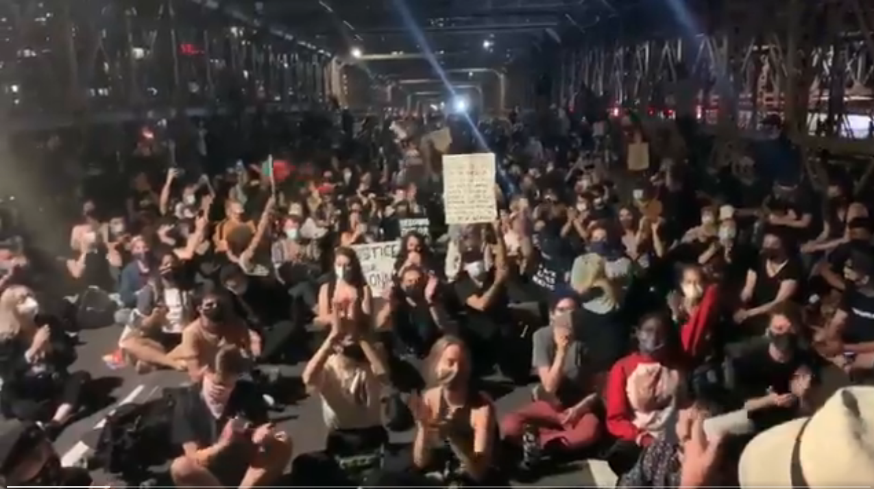 Protesters on the Brooklyn Bridge celebrate after marching from Barclays Center in honor of #BreonnaTaylor. #NYCProtest