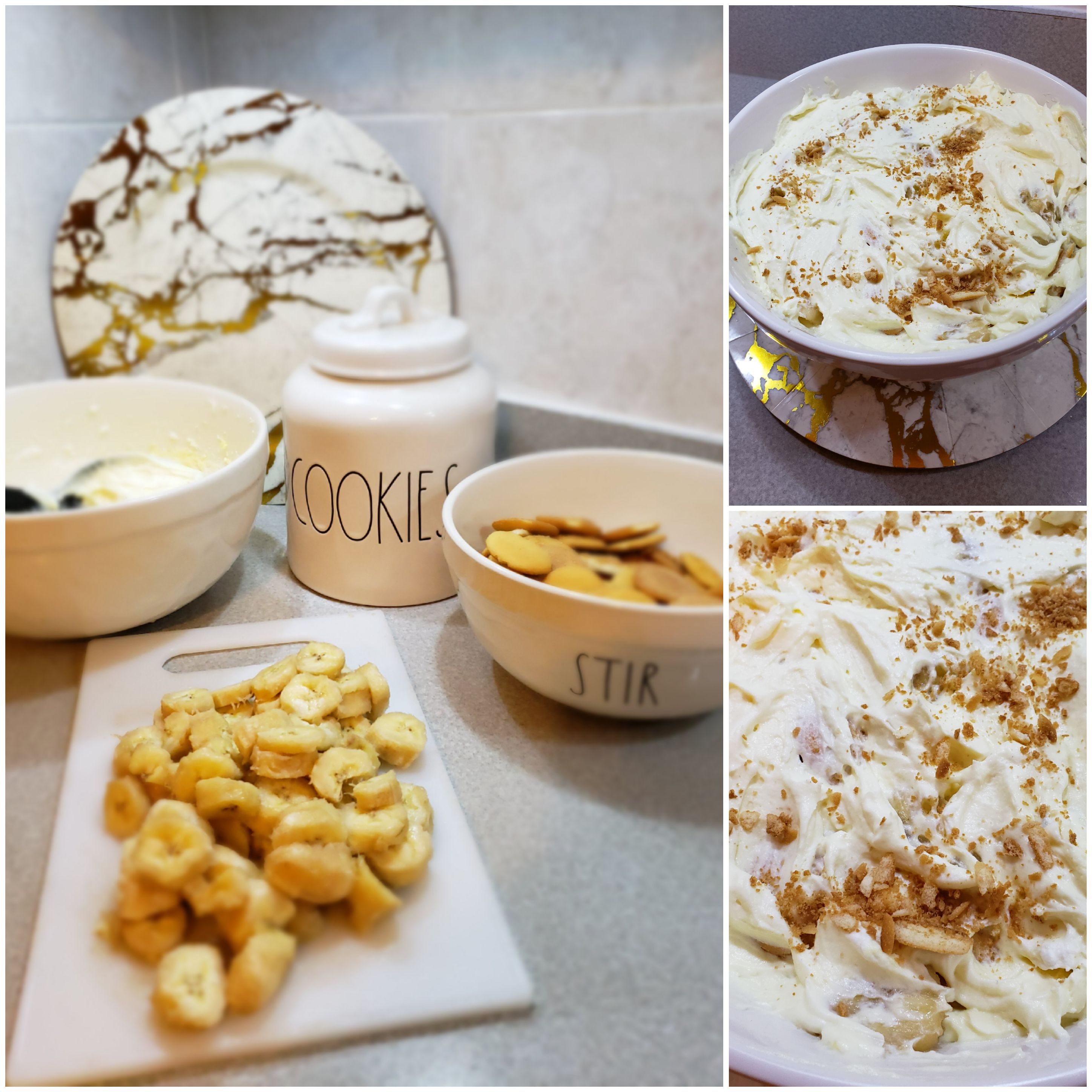 This is a collage photo of homemade banana pudding with its ingredients made by me.