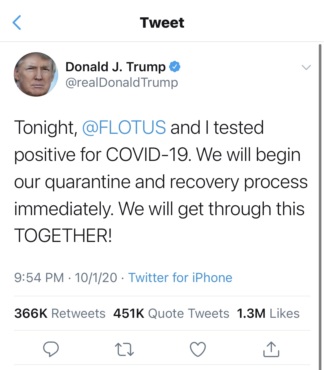 Late Thursday evening President Trump announced in a tweet both he and the First Lady, Melania Trump, tested positive for COVID-19 and will begin their quarantine.